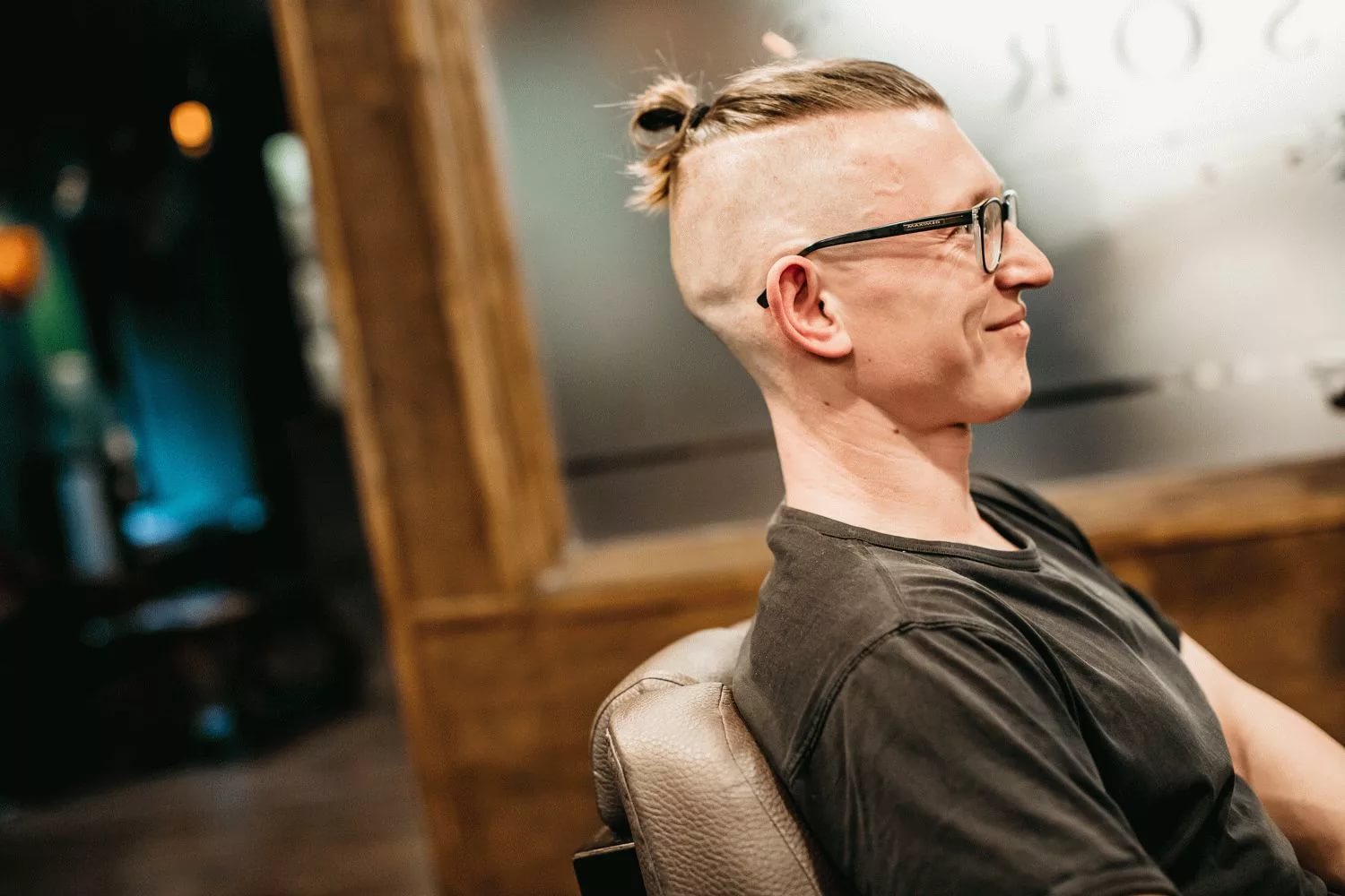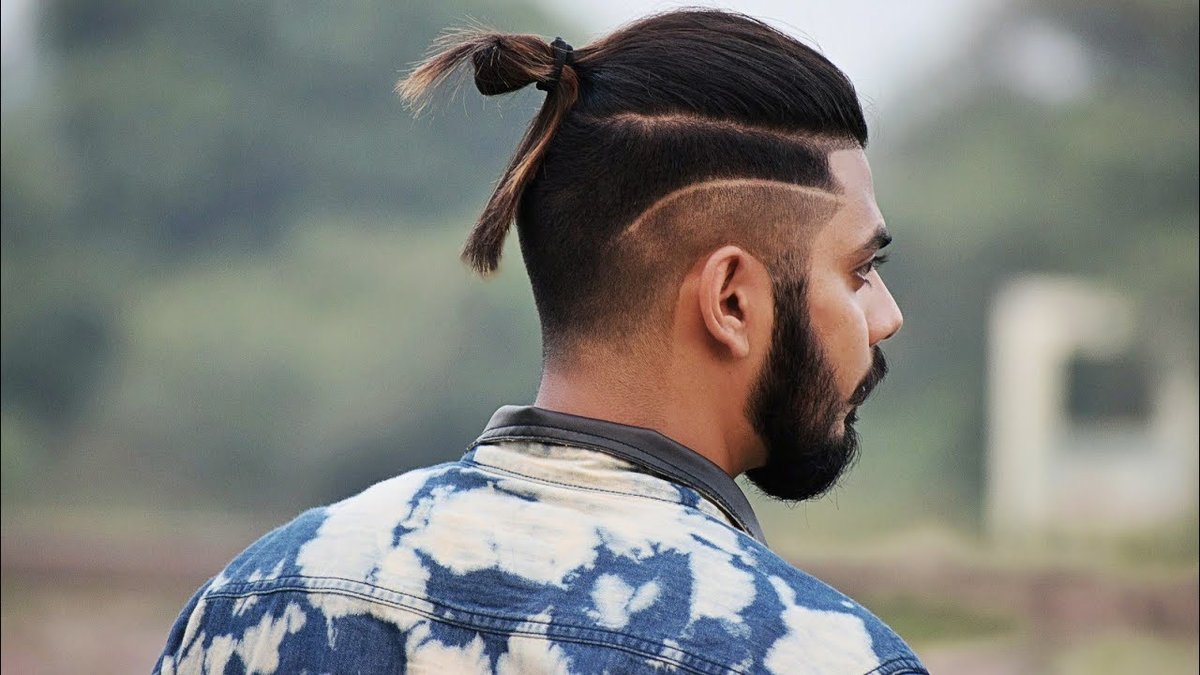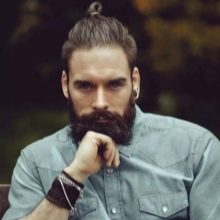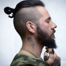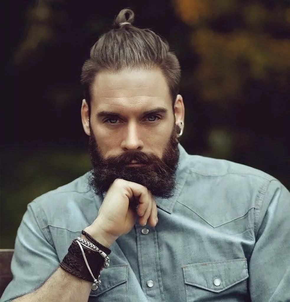 - Top Knot σε αρκετά μακριά μαλλιά. Το χτένισμα είναι μαζεμένο σε κουλούρι, τα υπόλοιπα μαλλιά ξυρίζονται στο ίδιο μήκος, η σιλουέτα ταιριάζει καλά με ένα τακτοποιημένο μούσι και μουστάκι.