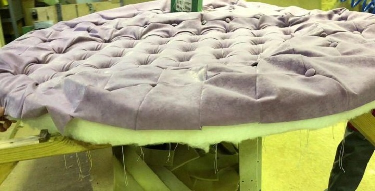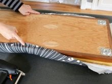 - Μόλις η δομή είναι έτοιμη, θα πρέπει να ξεκινήσετε την προετοιμασία ενός μοτίβου για ένα κομμάτι αφρώδους ελαστικού βέλτιστων μεγεθών. Στη συνέχεια, στερεώνεται στη βάση του πάγκου μέσω ειδικού συρραπτικού ή κόλλας υψηλής ποιότητας.