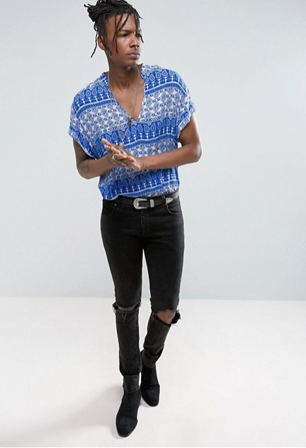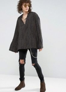 Τα μπλουζάκια με στιλ μπλούζον και μπλουζάκια δουλεύουν καλά με στενά τζιν. Ωστόσο, οι αναλογίες του σχήματος πρέπει να ληφθούν υπόψη έτσι ώστε η κορυφή να μην αποδειχθεί πολύ πιο μαζική από την κάτω. Τέτοια μοντέλα πουκάμισων είναι πιο κατάλληλα για άνδρες με αθλητική φιγούρα.