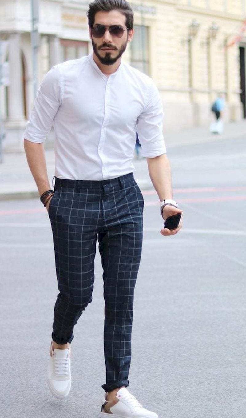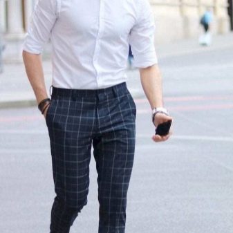 Δεν πρέπει να φοράτε καρό παντελόνι για ένα τέτοιο μοντέλο, αλλά θα ταιριάζουν καλά με ένα απλό. Μόνο το κλουβί πρέπει να είναι μεσαίου μεγέθους: όχι μικρό και όχι μεγάλο και επίσης όχι πολύ αντίθετο. Η επιλογή των παπουτσιών πρέπει επίσης να προσεγγιστεί σωστά - δεν συνδυάζονται όλα τα παπούτσια με καρό παντελόνι.
