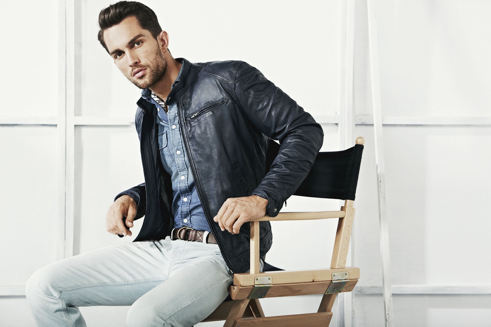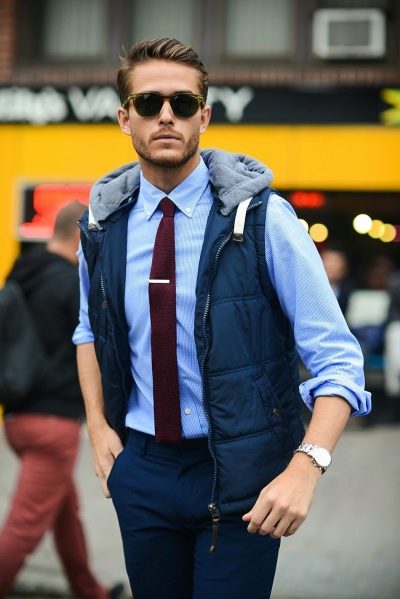 - Το κλασικό γαλάζιο πουκάμισο συμπληρώνεται με αξεσουάρ - γυαλιά, καπέλο και γραβάτα σε χρώμα με ελαφρώς κωνικό παντελόνι.