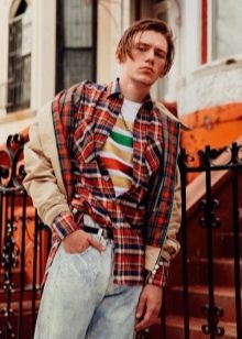 Τζιν φόρμα με πολύχρωμο πουκάμισο - μια κομψή και πρακτική εμφάνιση για νεαρά παιδιά. Για να φαίνεται το τόξο πιο εκφραστικό, συμπληρώθηκε με ένα καπάκι. Αυτά τα ρούχα είναι υπέροχα για καθημερινές βόλτες.