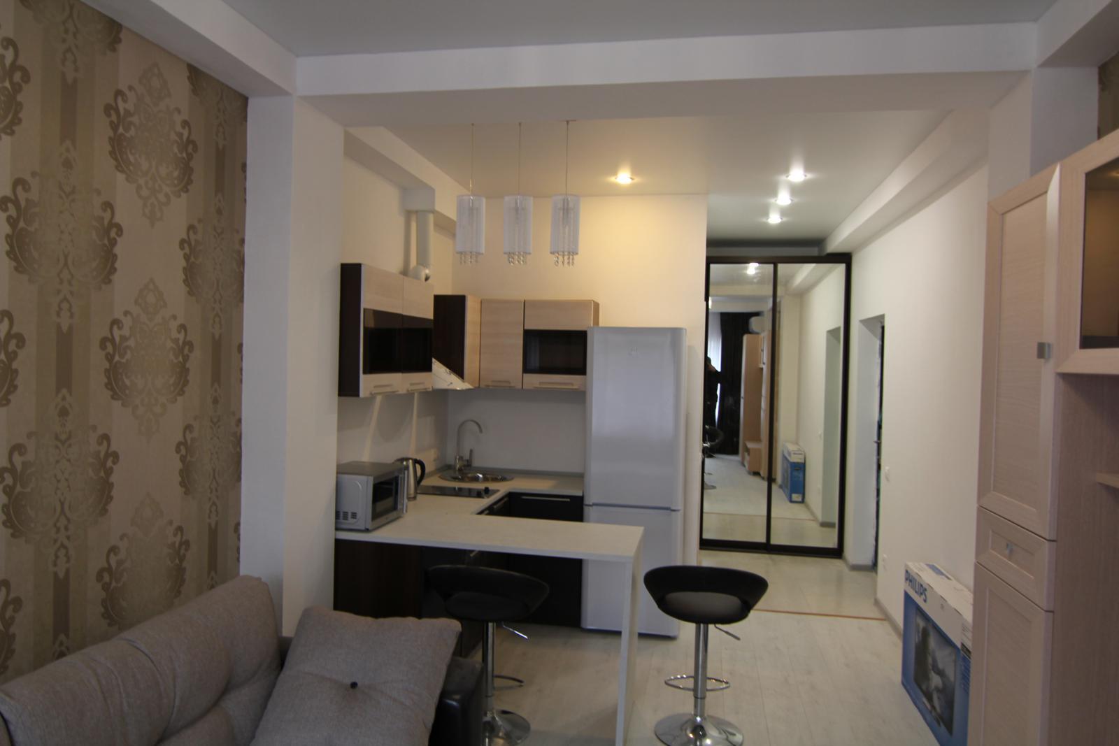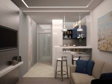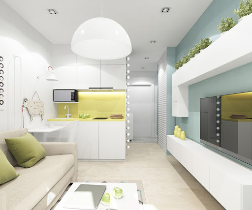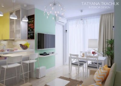 Ένα έργο ενός μικρού στούντιο που ταιριάζει σε όλα όσα χρειάζεστε για μια άνετη διαμονή. Ο χρωματικός συνδυασμός του στούντιο συνδυάζει τα χρώματα της φύσης: πορτοκαλί προσόψεις κουζίνας - ο ήλιος, μπλε οροφή - ο ουρανός, πράσινοι τοίχοι - ευρύχωρα λιβάδια.