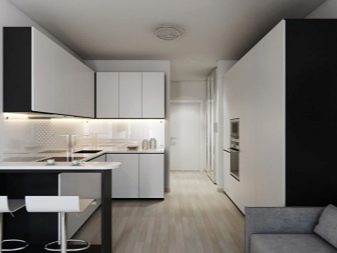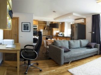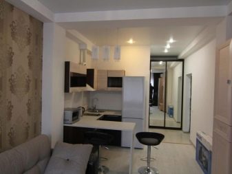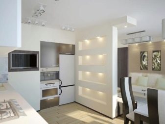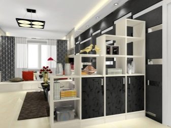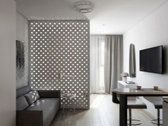 Μπορείτε να χωρίσετε την κουζίνα από το υπνοδωμάτιο με μια απλή κουρτίνα ή ένα ράφι με ράφια. Μια άλλη επιλογή είναι ένας μετρητής μπαρ. Είναι κατάλληλο για μικρές οικογένειες χωρίς παιδιά. Για συνταξιούχους και οικογένειες με παιδιά, είναι καλύτερο να επιλέξετε μια διαφορετική επιλογή για τη δημιουργία ζωνών.