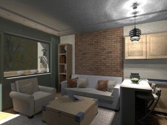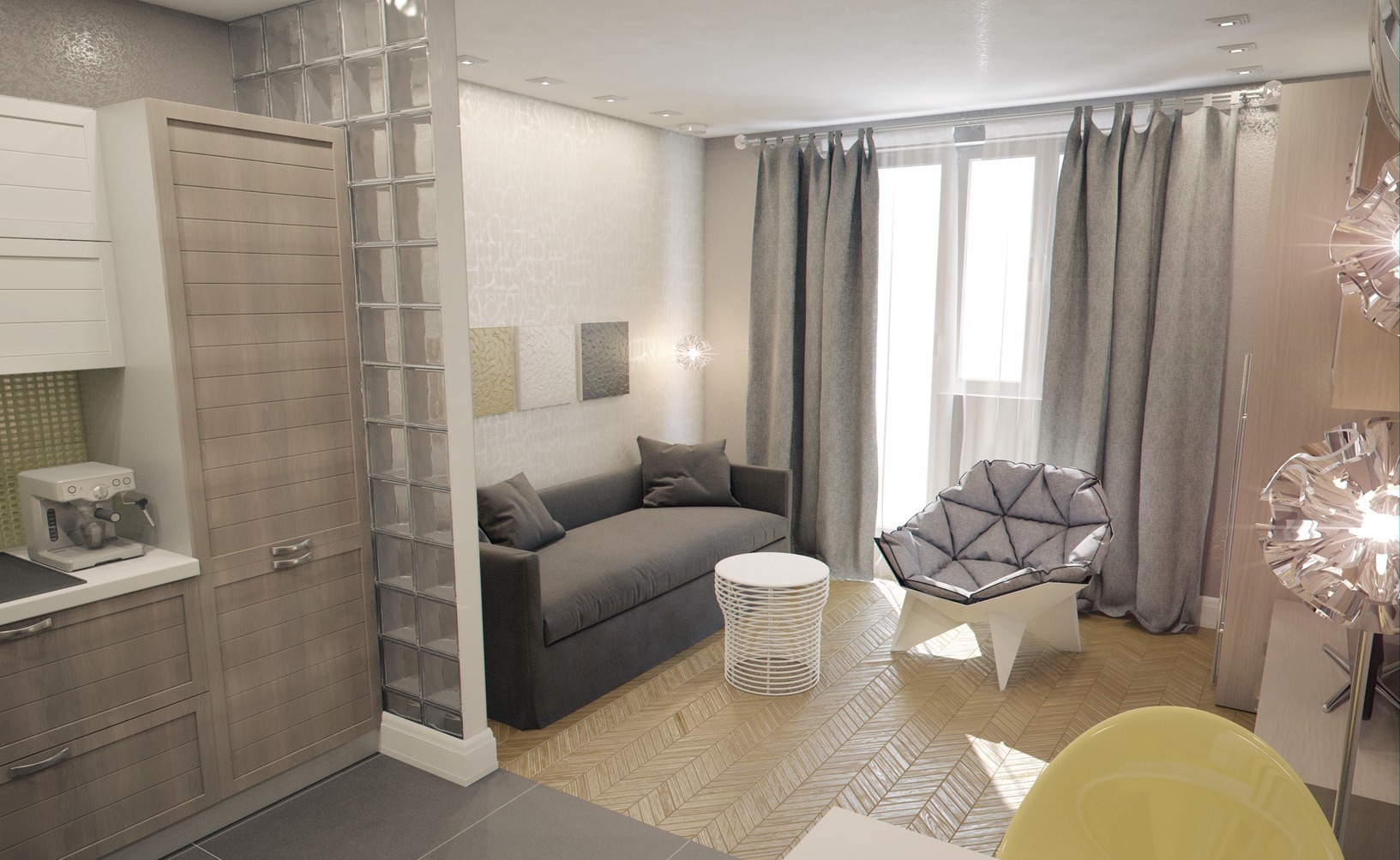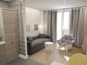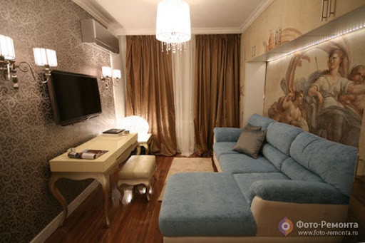 Υπάρχει καναπές -κρεβάτι για ύπνο. Απέναντι υπάρχει μια τηλεόραση. Για πράγματα στο διάδρομο - ντουλάπα. Το πλεονέκτημα αυτής της διάταξης είναι η διαθεσιμότητά του: σχεδόν όλα τα είδη αγοράστηκαν στο κατάστημα IKEA.