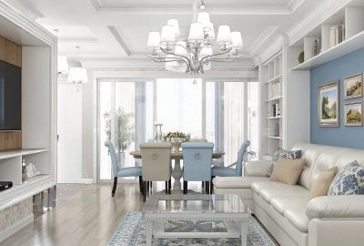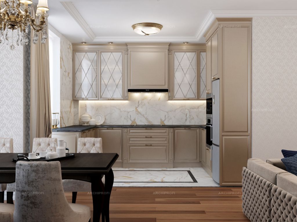 Στούντιο έργου 15 τ. m από έναν επαγγελματία σχεδιαστή που δημιουργήθηκε στο ύφος του νεοκλασικισμού. Τα κύρια χρώματα του εσωτερικού είναι το λευκό, το μπλε και το μπεζ. Το σετ στην κουζίνα δεν καταλαμβάνει πολύ χώρο, όπως και ο εξοπλισμός με τον οποίο είναι εξοπλισμένο. Η τραπεζαρία συνδυάζεται με τον χώρο εργασίας.