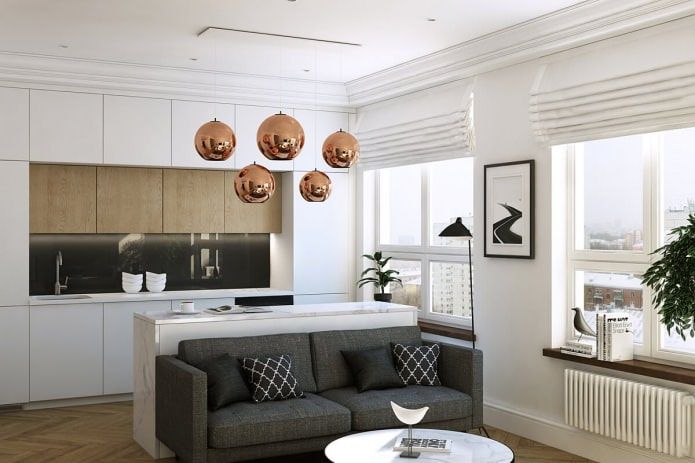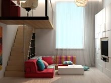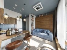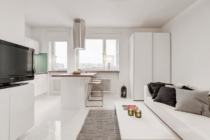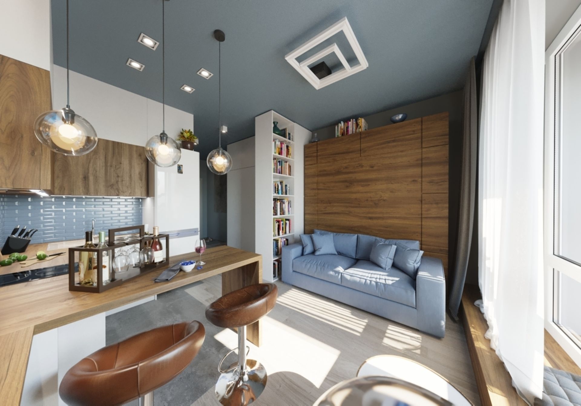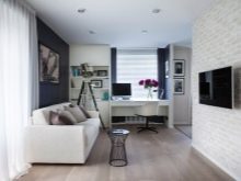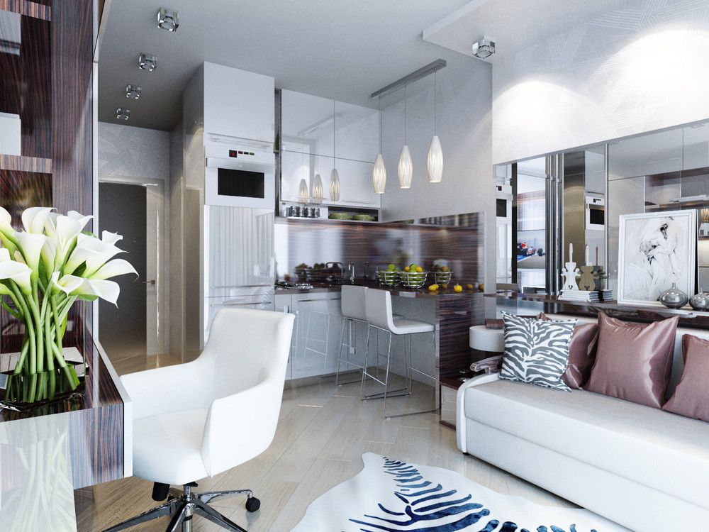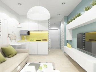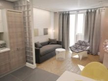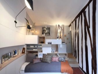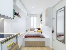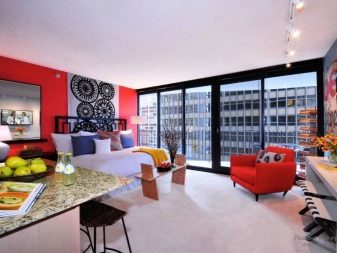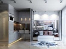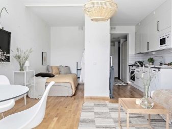 Η δημιουργία ενός διαμερίσματος στούντιο δεν είναι εύκολη υπόθεση, αλλά ακόμη και εδώ, οι σχεδιαστές μπορούν να δώσουν στους αρχάριους μερικές συμβουλές. Τα περισσότερα έπιπλα πρέπει να είναι εργονομικά. Οι καλύτερες επιλογές θα είναι πτυσσόμενα τραπέζια και καρέκλες με λεπτά πόδια, κινητοί καναπέδες που διπλώνουν σε κρεβάτι, πάγκοι μπαρ που μετατρέπουν την κουζίνα σε τραπεζαρία, συστήματα ραφιών και συρόμενες ντουλάπες που μπορούν κυριολεκτικά να «κοπούν» στον τοίχο ή βοηθούν στην επίτευξη πρόσθετης διαίρεσης του χώρου.