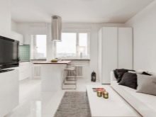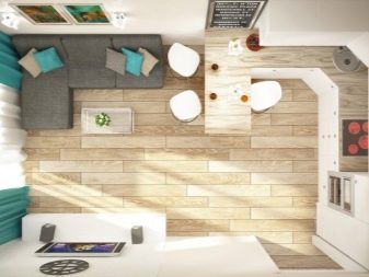 Ωστόσο, η ζώνη με χρώμα είναι πιο εύκολο να πραγματοποιηθεί, αφού ακόμη και μια μετάβαση από τους τόνους κοντά ο ένας στον άλλο θα δημιουργήσει αμέσως την ψευδαίσθηση των ξεχωριστών δωματίων.... Ο συνδυασμός φωτεινών αποχρώσεων, σε συνδυασμό μεταξύ τους, όχι μόνο διατηρεί την αίσθηση του ελεύθερου χώρου, αλλά και τον χωρίζει λογικά ανάλογα με τη λειτουργία. Και αυτό δεν ισχύει μόνο για τους τοίχους: η χρήση πλακιδίων στην κουζίνα, η οποία στο χρώμα και στο στολίδι θα είναι πολύ διαφορετική από το υπόλοιπο υλικό που καλύπτει το πάτωμα, θα καταστήσει σαφές ότι ένα άτομο εισέρχεται στο έδαφος ενός εντελώς διαφορετικό δωμάτιο.