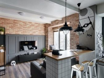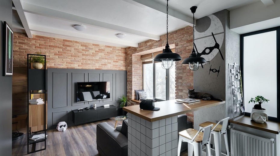 Για μια νεαρή οικογένεια, ένα μοντέρνο ή βιομηχανικό σχέδιο είναι κατάλληλο: συνεπάγεται τη χρήση unisex χρωμάτων (φυσικά, οι αποχρώσεις δεν έχουν σαφή διάκριση φύλου, αλλά οι ανθρώπινες προκαταλήψεις είναι έντονες ακόμη και όταν επιλέγουν εσωτερικό) όπως το σκούρο μπλε, γκρι ή μπορντό. Γεωμετρικά σχήματα, μεταλλικές κατασκευές - κάθε σύγχρονη τεχνολογία θα ταιριάζει απόλυτα σε ένα τέτοιο σχέδιο, είτε πρόκειται για μουσικό κέντρο, αποκωδικοποιητή ή πίνακες τηλεόρασης πλάσματος.