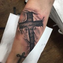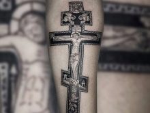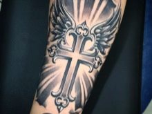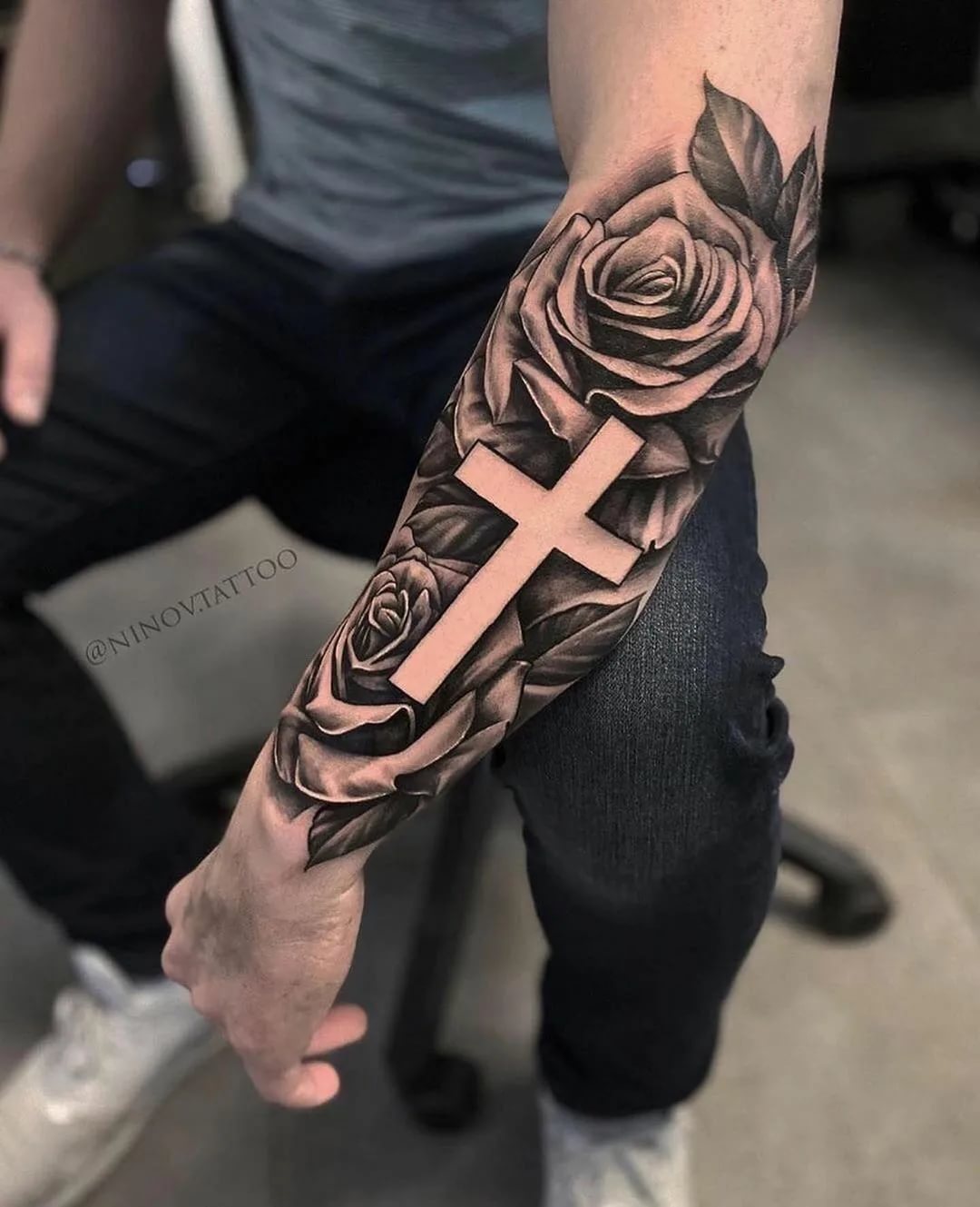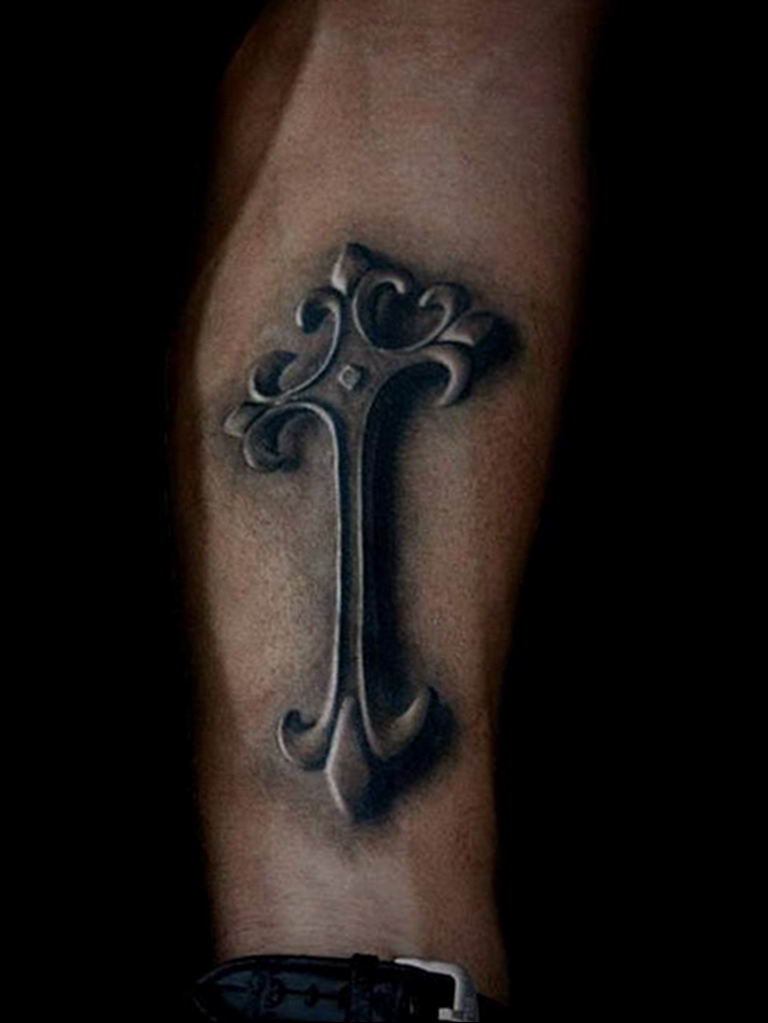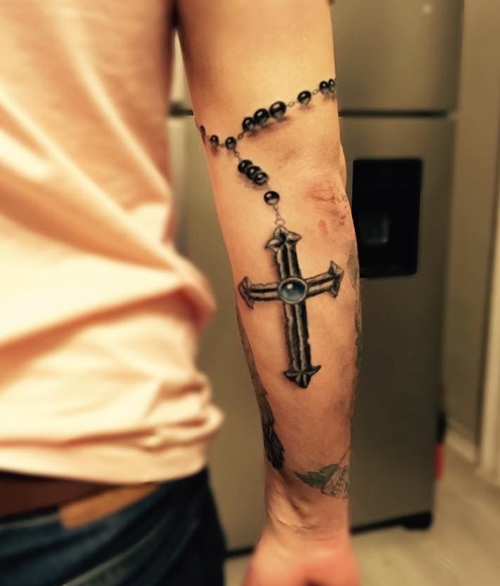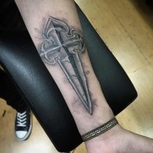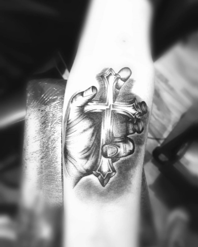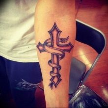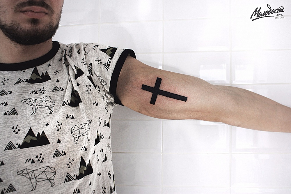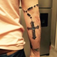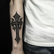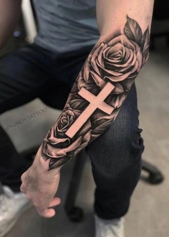 - Στο αντιβράχιο. Αυτό το μέρος είναι πολύ δημοφιλές στους άνδρες. Ο σταυρός σε αυτό το μέρος δείχνει ότι ο ιδιοκτήτης ενός τέτοιου φορετού μοτίβου ασχολείται ιδιαίτερα με την εικόνα του, έλκεται από τον Θεό, έχει έναν εσωτερικό πυρήνα.