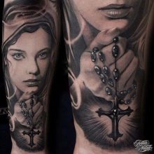 - Το σχέδιο, στο οποίο ένα κορίτσι κρατά ένα σταυρό με ένα κομπολόι, προσελκύει την προσοχή με βαθύ νόημα και μεγάλο μέγεθος. Μόνο ένας επαγγελματίας μπορεί να απεικονίσει ένα τέτοιο αριστούργημα.