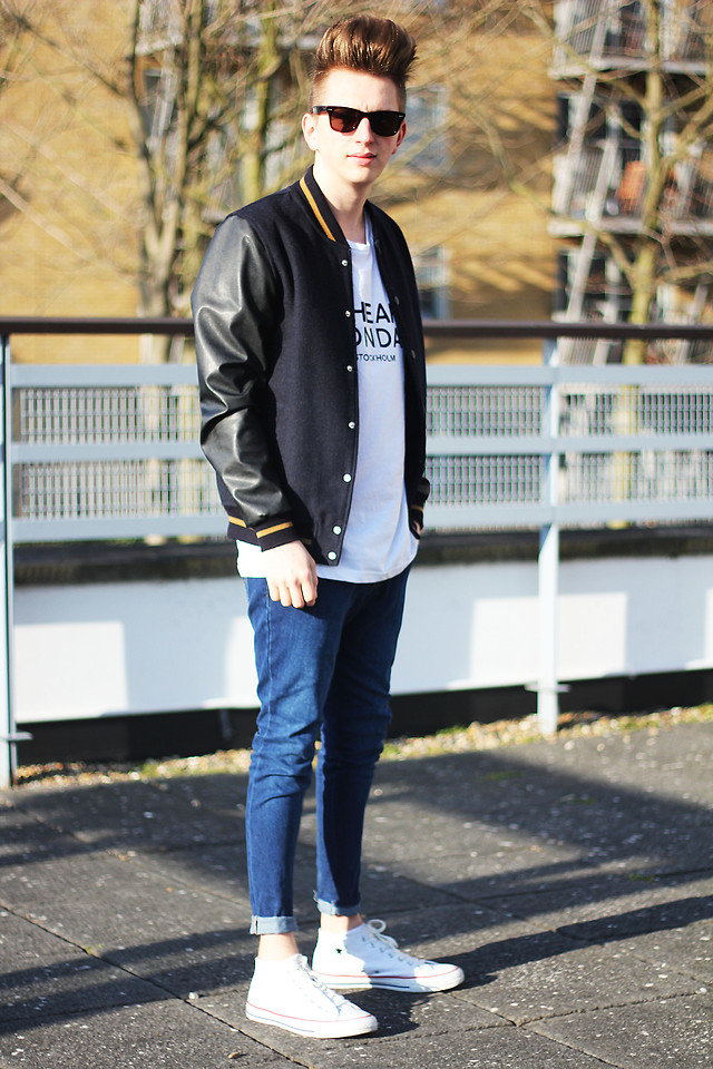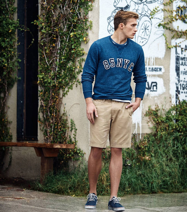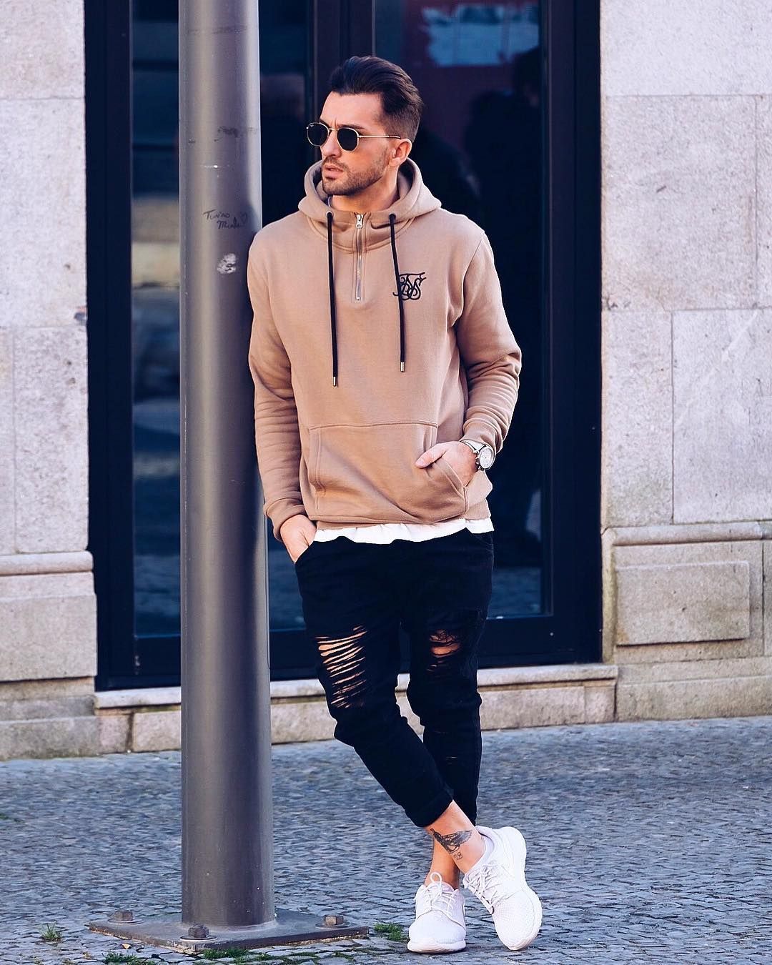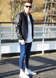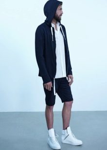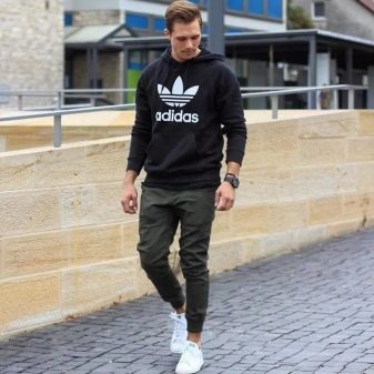 - Ευέλικτα φούτερ όπως βομβιστές ή φούτερ, μπορεί να φορεθεί με οτιδήποτε. Πολλοί άντρες προσθέτουν κανονικά τζιν και ίσια παντελόνια σε τέτοια τόξα. Οι μπλούζες μπορούν να συμπληρωθούν με πουκάμισα, μπλουζάκια ή γκολφ. Δεν υπάρχουν σχεδόν κανένας περιορισμός στα υποδήματα - μπορείτε να φορέσετε τόσο κανονικές μπότες όσο και αθλητικά παπούτσια. Πολλά εξαρτώνται από την αρμονία του συνδυασμού χρωμάτων.