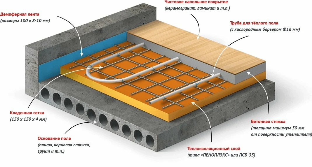 Η εγκατάσταση δαπέδου που θερμαίνεται με νερό πραγματοποιείται σε τσιμεντένια επίστρωση. Το σκυρόδεμα είναι καλός αγωγός θερμότητας και το διατηρεί για μεγάλο χρονικό διάστημα. Το πάτωμα στο οποίο σχεδιάζεται η εργασία πρέπει να έχει μια επίπεδη επιφάνεια - αυτό είναι σημαντικό, καθώς κατά την κατασκευή κτιρίων, οι πλάκες μπαλκονιού γίνονται συχνά σε μικρή κλίση, έτσι ώστε το νερό να μην συσσωρεύεται, αλλά να ρέει ανεμπόδιστα.
