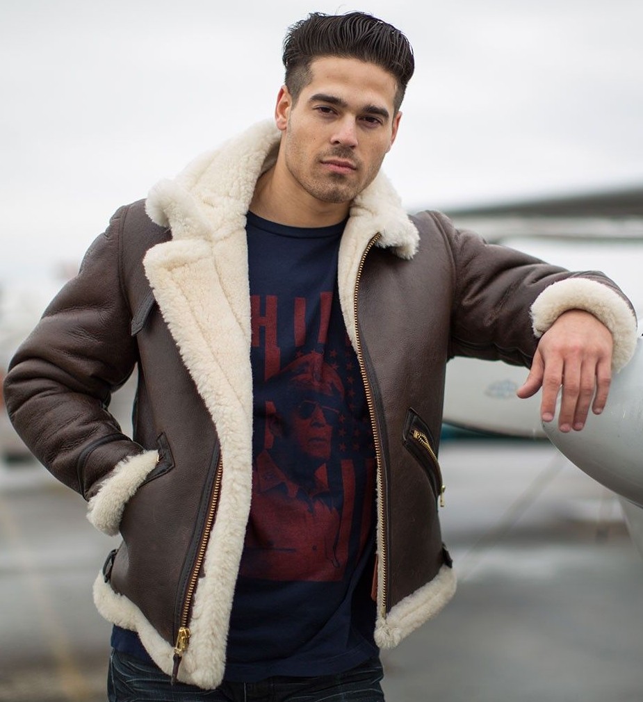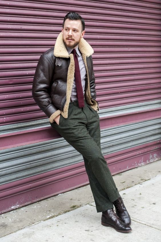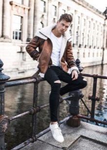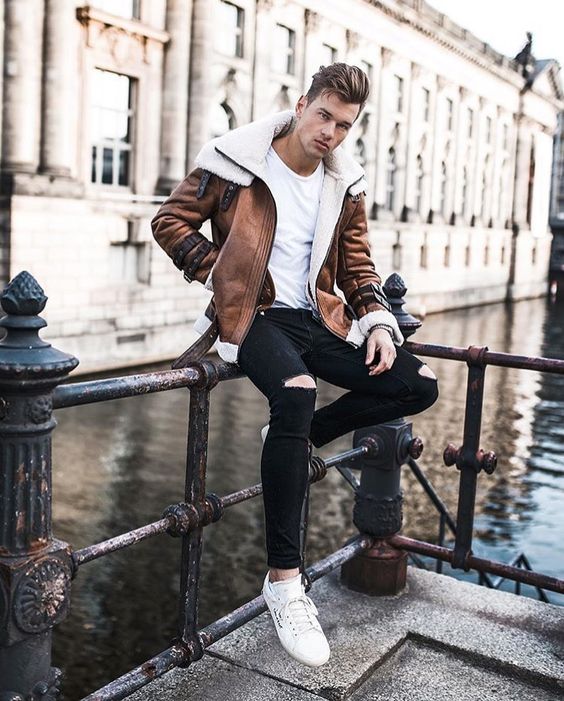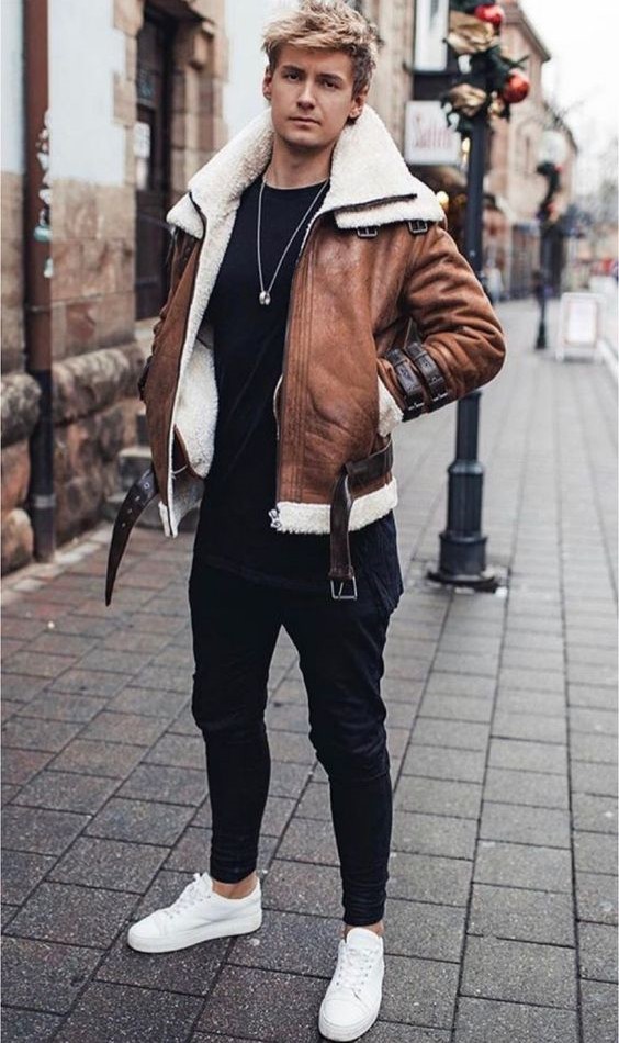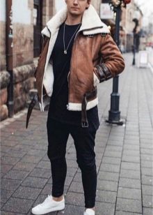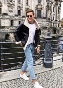 Ένα παλτό από δέρμα προβάτου αεροπόρου με ελαφριά επένδυση θα είναι ένα καλό συμπλήρωμα για μπλε τζιν και λευκά μονωμένα πάνινα παπούτσια. Αυτός είναι ένας από τους πιο δημοφιλείς συνδυασμούς ρούχων. Ένα σακάκι με shearling και ένα τζιν σκισμένο με κάρβουνο είναι μια εξαιρετική φόρμουλα στολή για να έχετε στο οπλοστάσιό σας. Ολοκληρώστε αυτό το casual look με ασπρόμαυρα πάνινα πάνινα παπούτσια.