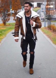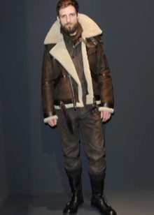 Βίαιο στυλ, ψηλό γιακά, αντρικά χρώματα και γούνα - όλα αυτά συνδυάζονται σε ένα κλασικό παλτό από δέρμα προβάτου του στυλ "αεροπόρος". Και παρόλο που αυτό το εξωτερικό ρούχο είναι μικρό σε μήκος, θερμαίνεται αξιόπιστα σε κρύο καιρό και δεν κρύβει τα πλεονεκτήματα του σχήματος.
