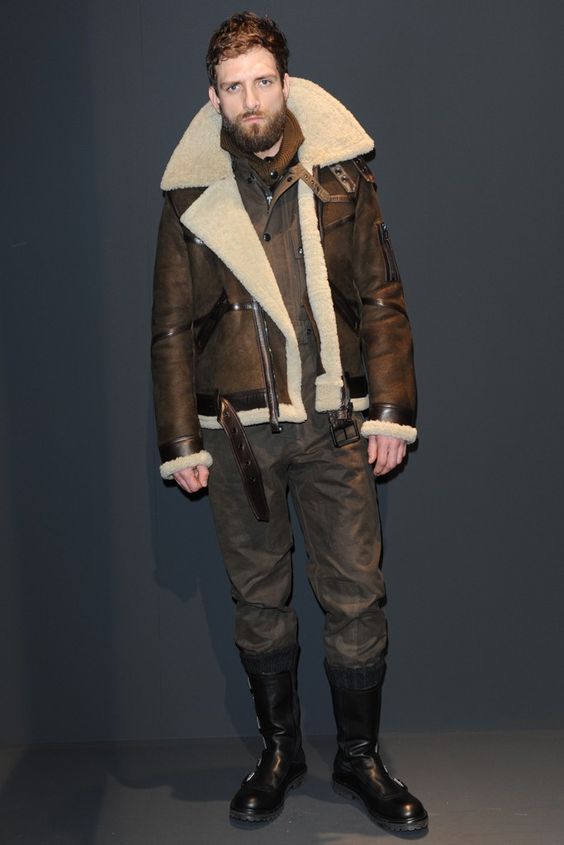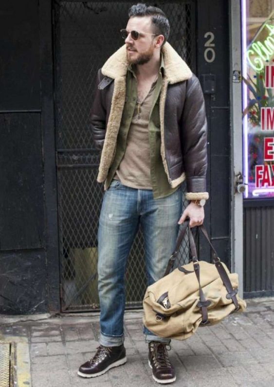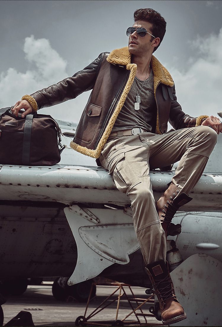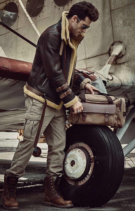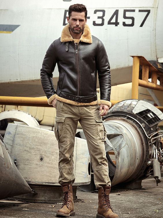 Για μια πιο κλασική εμφάνιση, συνδυάστε ένα ελαιόλαδο cargo παντελόνι, ένα μπλουζάκι, κανονικές μαύρες μπότες και ένα σκούρο παλτό αεροπόρου από δέρμα προβάτου.