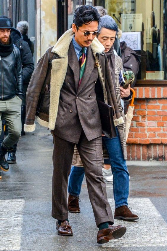 Σε αυτό το βλέμμα, ένα μοντέρνο καφέ παλτό -πιλότο από δέρμα προβάτου συνδυάζεται με επιτυχία με στοιχεία μιας κλασικής ντουλάπας - άλτης και παντελόνι.