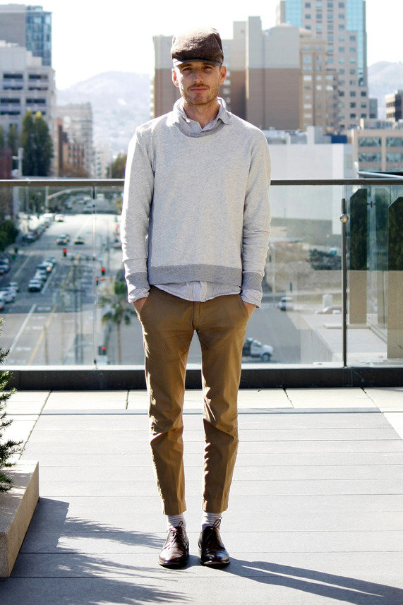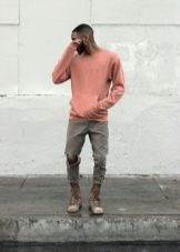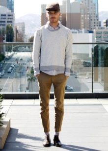 - Super-slim chinos with pullover. The neutral colors of the trousers and sweatshirts are complemented by bright and bold orange moccasins.