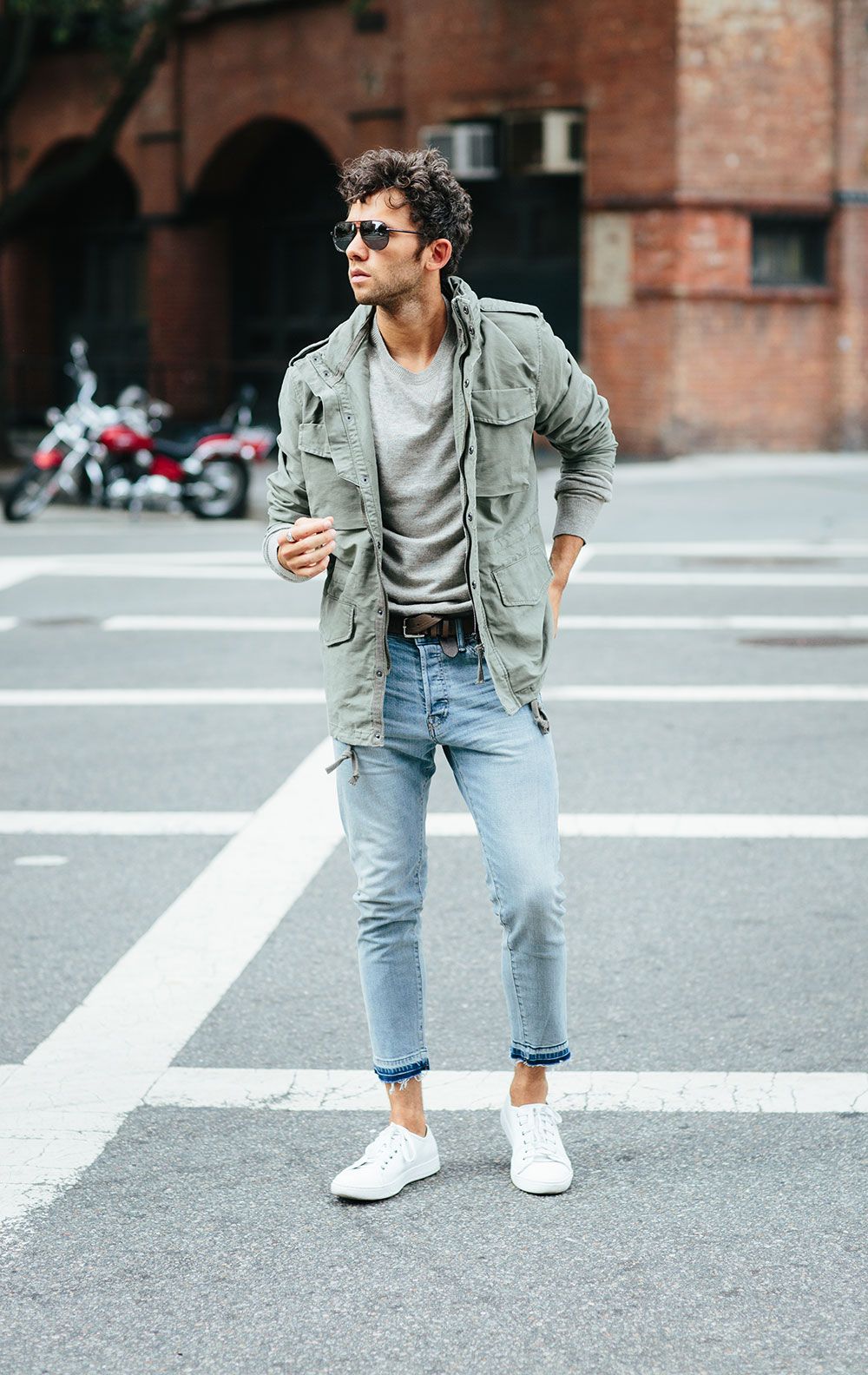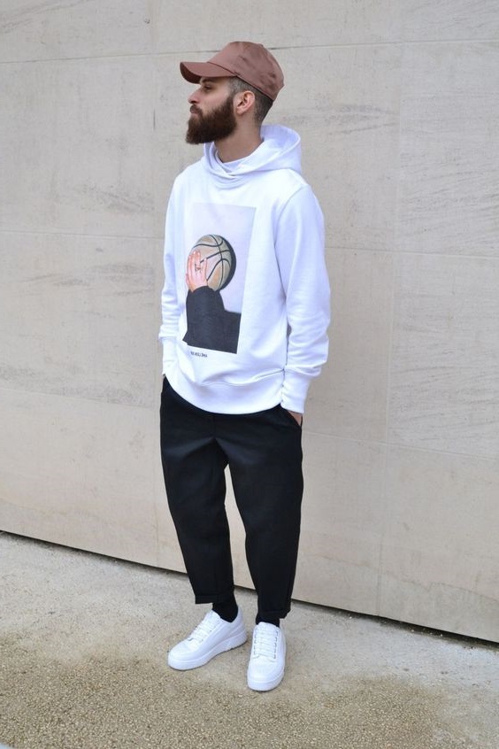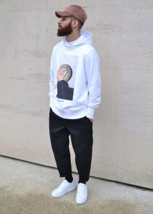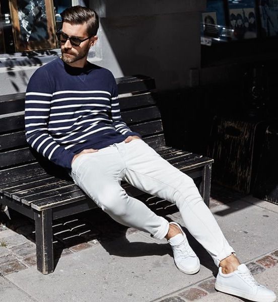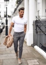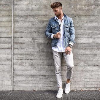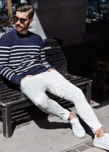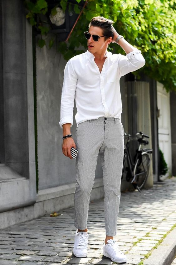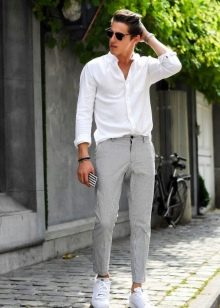 - The next image showcases a less formal look, with sneakers and a plain white shirt making it casual but no less successful. Excellent combination of pure white with gray-blue shades.