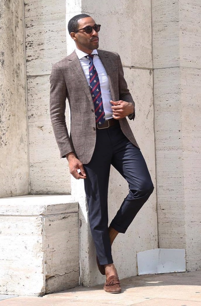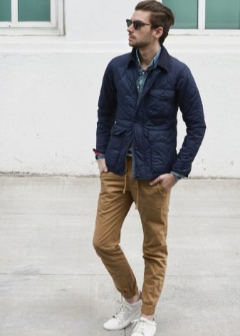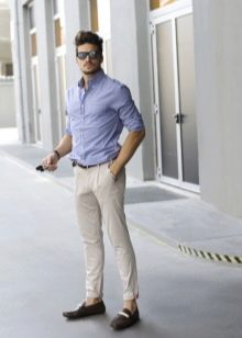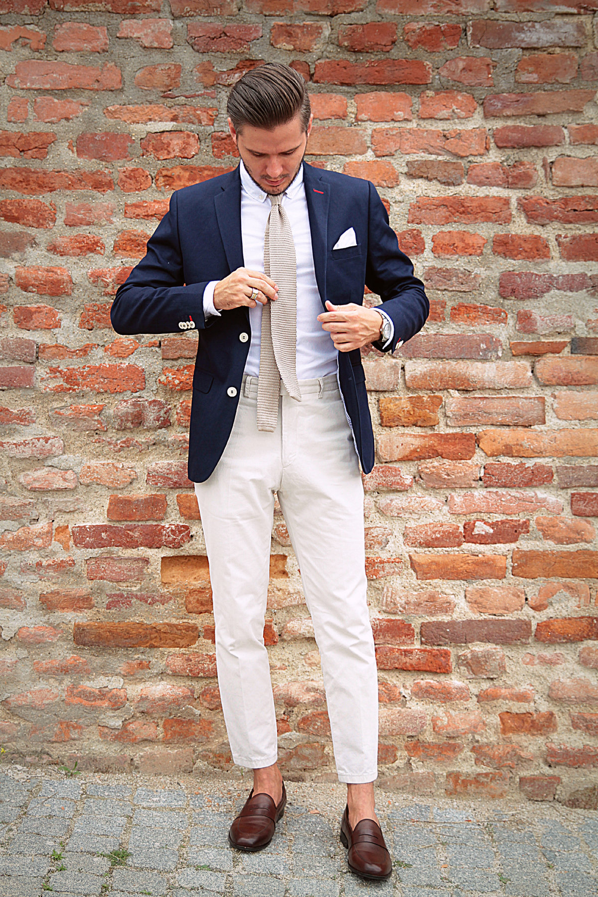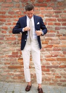 - The photo shows the perfect combination of chinos with a jacket and dress shirt. Draw your attention to the colors: noble dark blue and pleasant beige. Loafers without socks fit perfectly into the image.