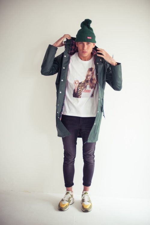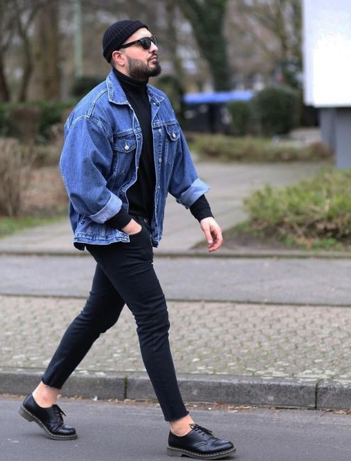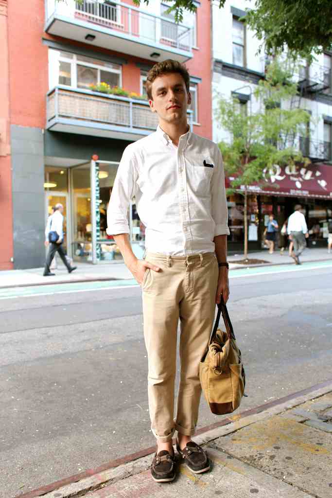 - Shown here is a pairing of chinos with lace-up boots and a stylish oversized shirt. Please note that the bottom of the shirt does not cross the line of the pockets.
