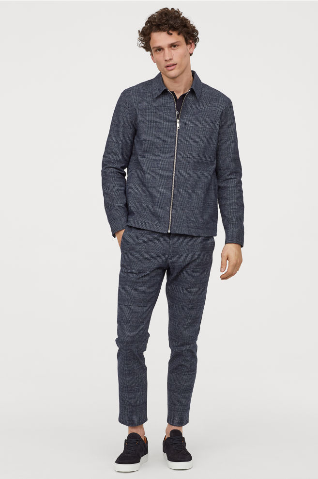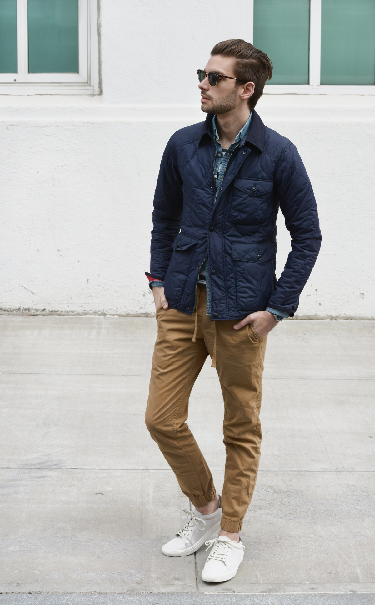 - A good look for cooler weather. Cropped khaki pants and a navy blue jacket complete the look with white sneakers.