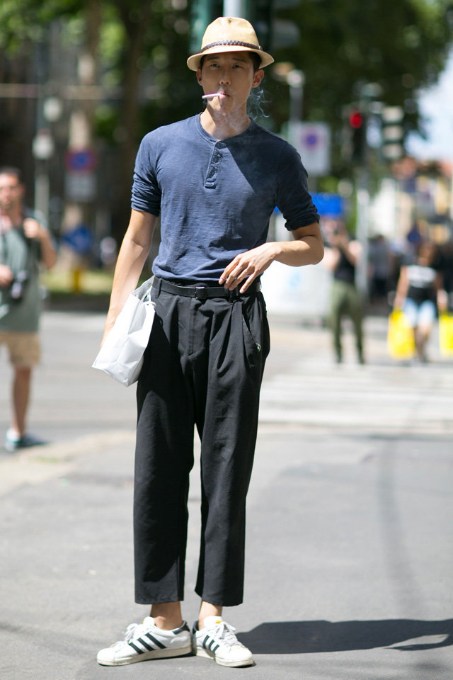 Pants of this cut can be either narrow or wide. Chinos tapered downwards are popular, but straight ones that are more familiar to us do not lag behind them.
