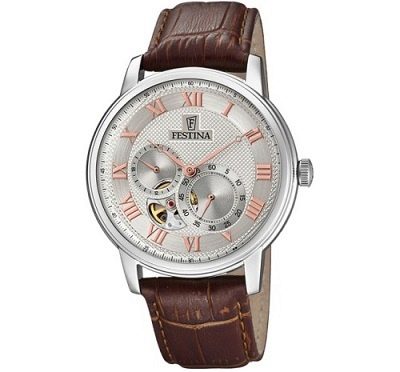 - Festina F6858.2 Is a mechanical watch with automatic winding function Open Heart. The glass on this watch is mineral, the dial color is gray. The body is made of steel. Water resistance is 5 ATM. Roman numerals are used as indication.