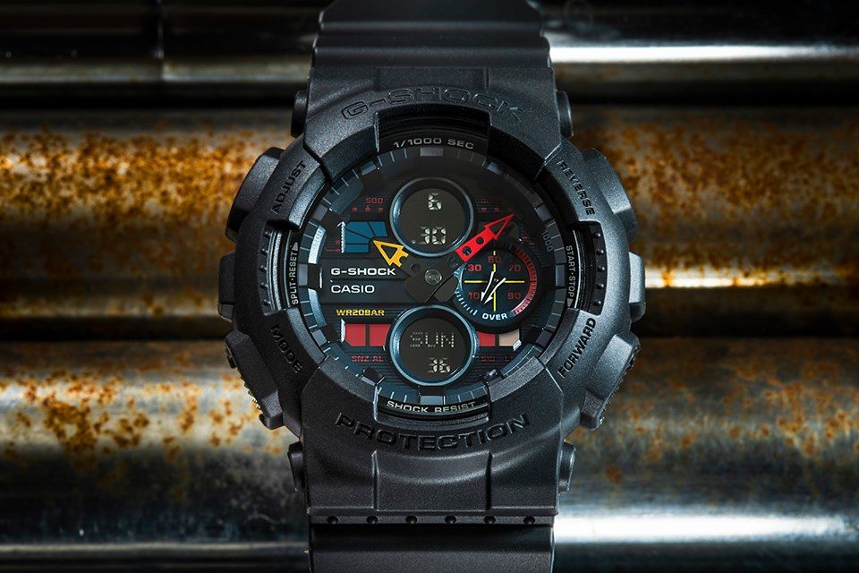 - Casio G-Shock GA-2000-1A9ER Chronograph... Analog-digital split with world time display, made in stylish "aviation" design. The dial is clearly marked with an X-shaped division into zones, and the mode change indicator resembles an aircraft propeller. The watch is brutal, rather large - 51.2 × 48.7 mm, but weighs only 60 g. The model is presented in a wide variety of colors.