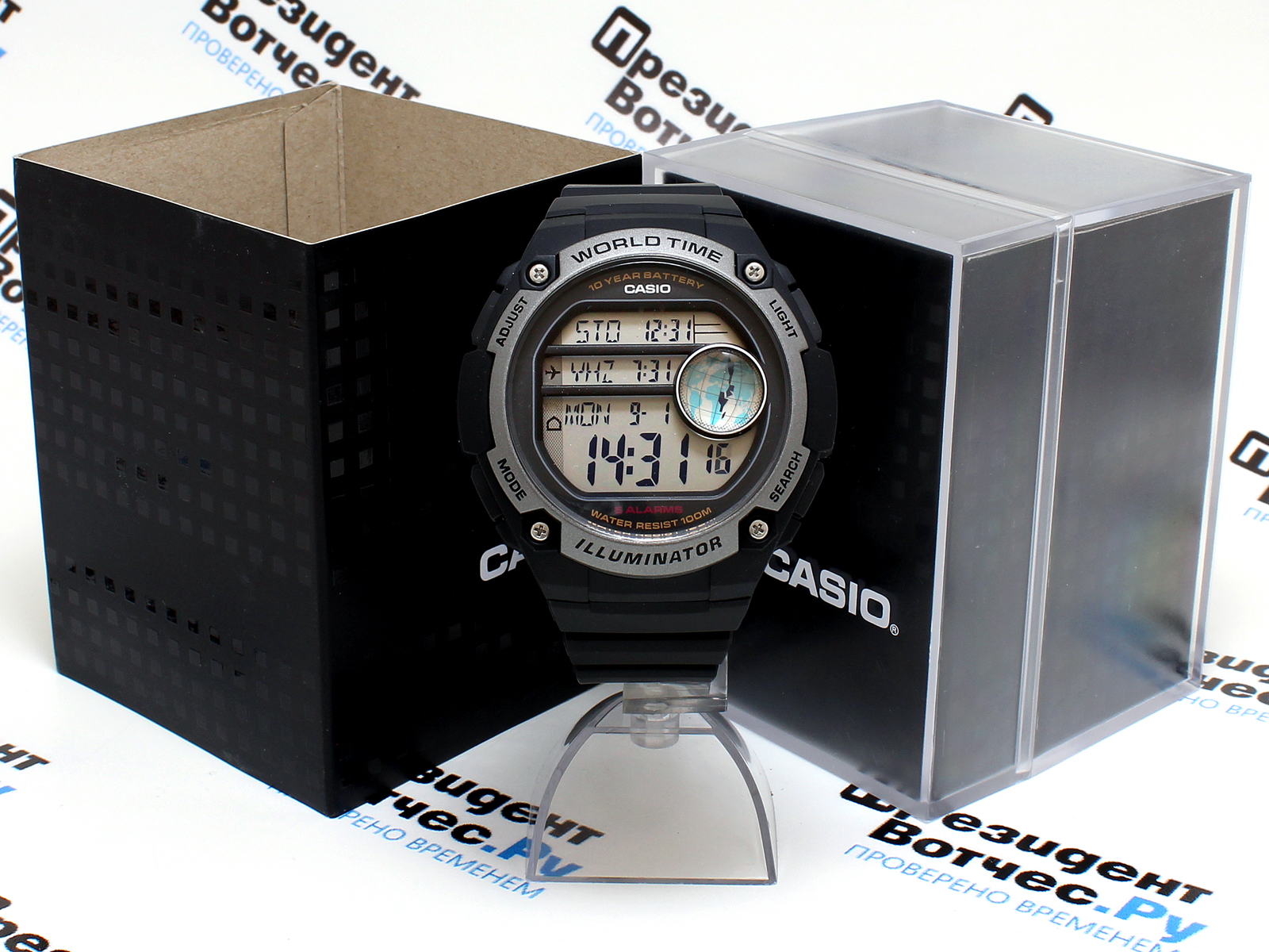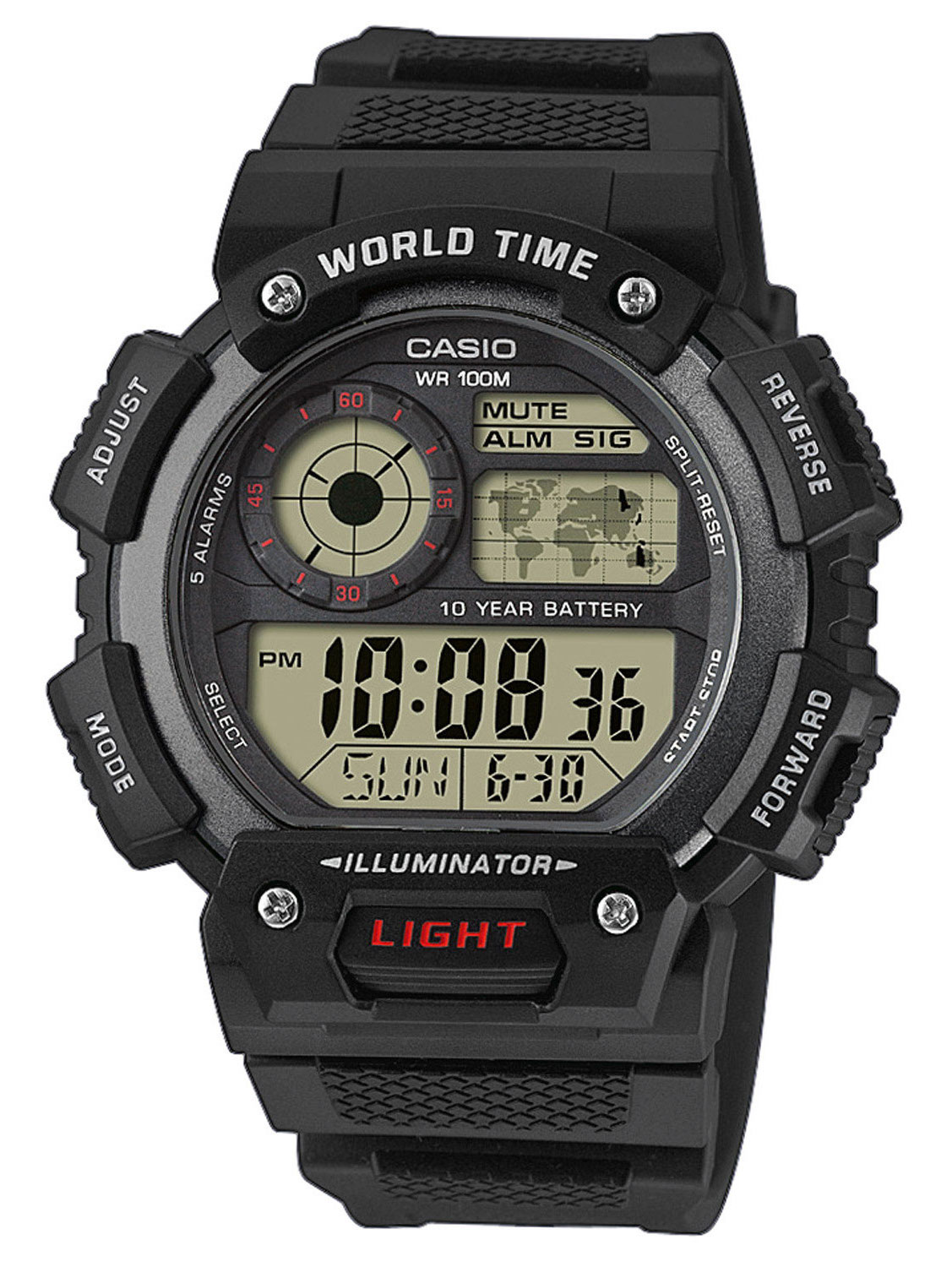 - Collection AE-2100W-4AVEF. Stylish watch in a polymer case with mineral glass and flexible elastic strap. The model has a capacious battery for 10 years of operation. The case is completely waterproof, withstands pressures up to 20 bar, suitable for diving without scuba gear. The large information display shows the calendar date, updated automatically, you can choose a convenient time format, use a stopwatch, timer and LED backlight.