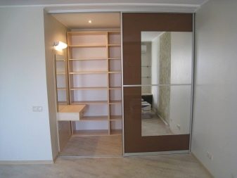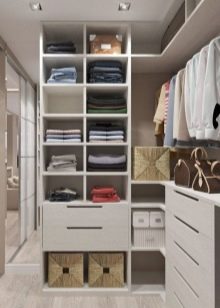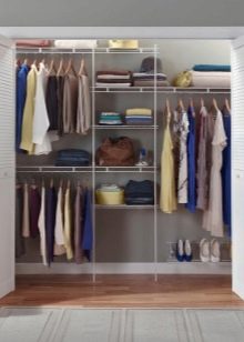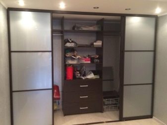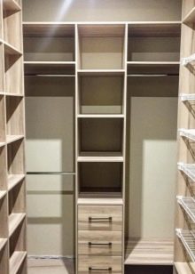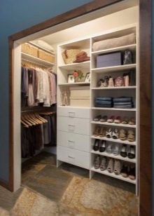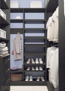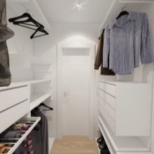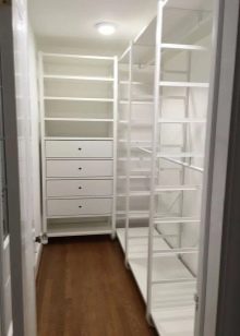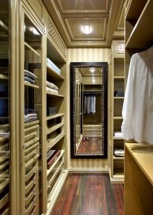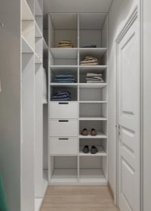 In a small dressing room, you can place shelves or a small wardrobe. When choosing a cabinet, preference should be given to options for the ceiling. But it is worth noting that a large wardrobe will visually eat up quite a lot of space, which is why experts recommend choosing a special system for dressing rooms, which is called "floor-ceiling". It is carried out exclusively according to individual measurements and resembles a wardrobe, only without side walls. The rails along which the doors move are attached to the floor and ceiling, and the "filling" of this cabinet is chosen according to your own preferences.