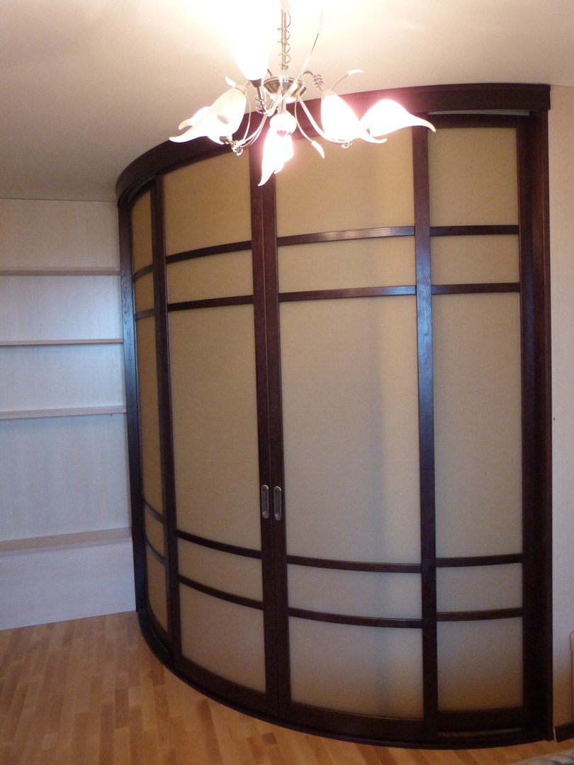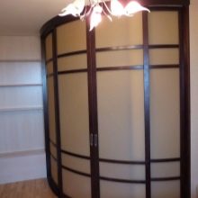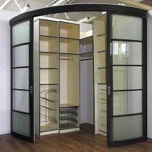 If the dressing room is planned at the stage of house renovation, then you can consider installing radius doors in the future. They look very unusual and airy, they can complement any classic or modern interior. At the same time, they visually increase the space.