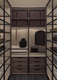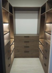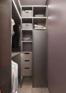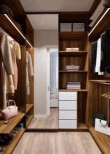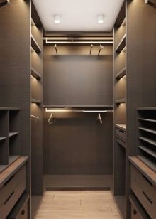 The dressing room, made in brown shades with additional lighting inside the shelves, looks very advantageous. Despite its compactness, it is very roomy. There are drawers here, as well as places for things that need to be hung and for those that just need to be folded. And also there is a lot of space for accessories, for example, bags, which should be in sight.