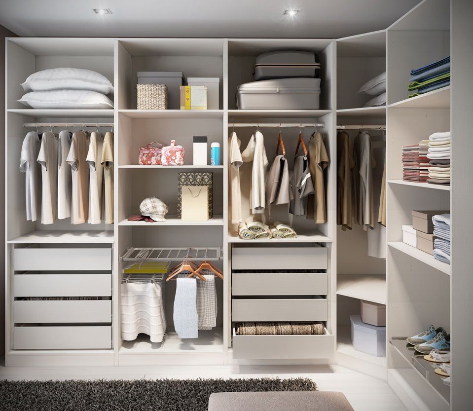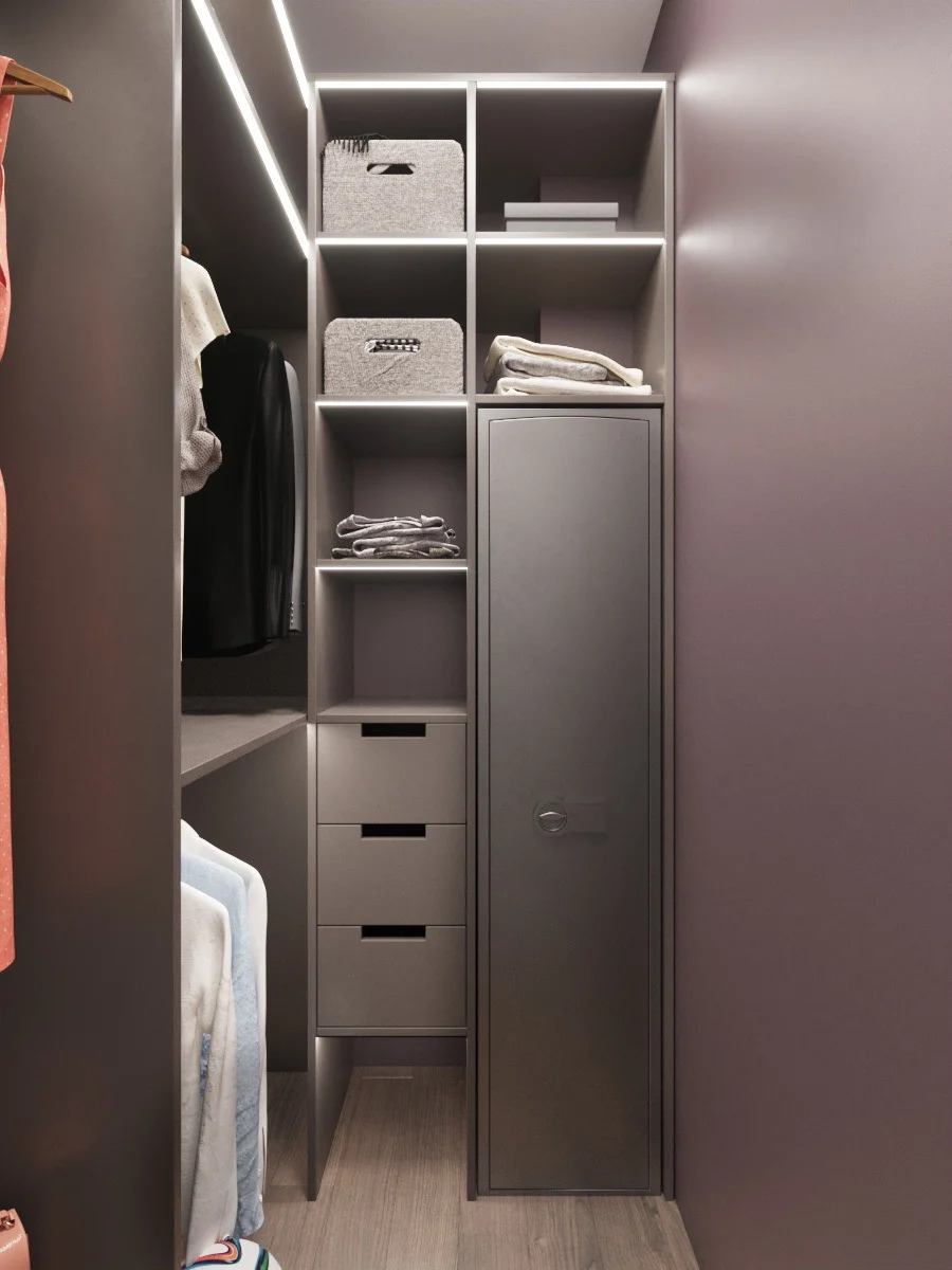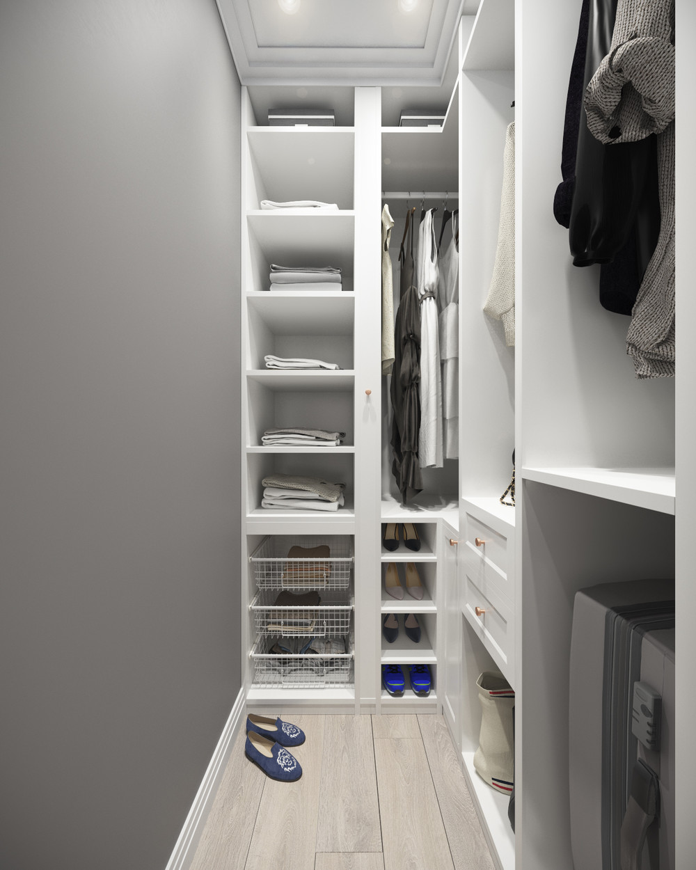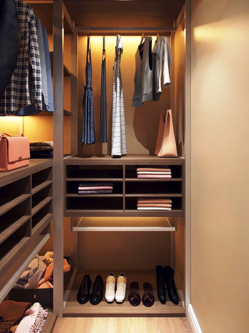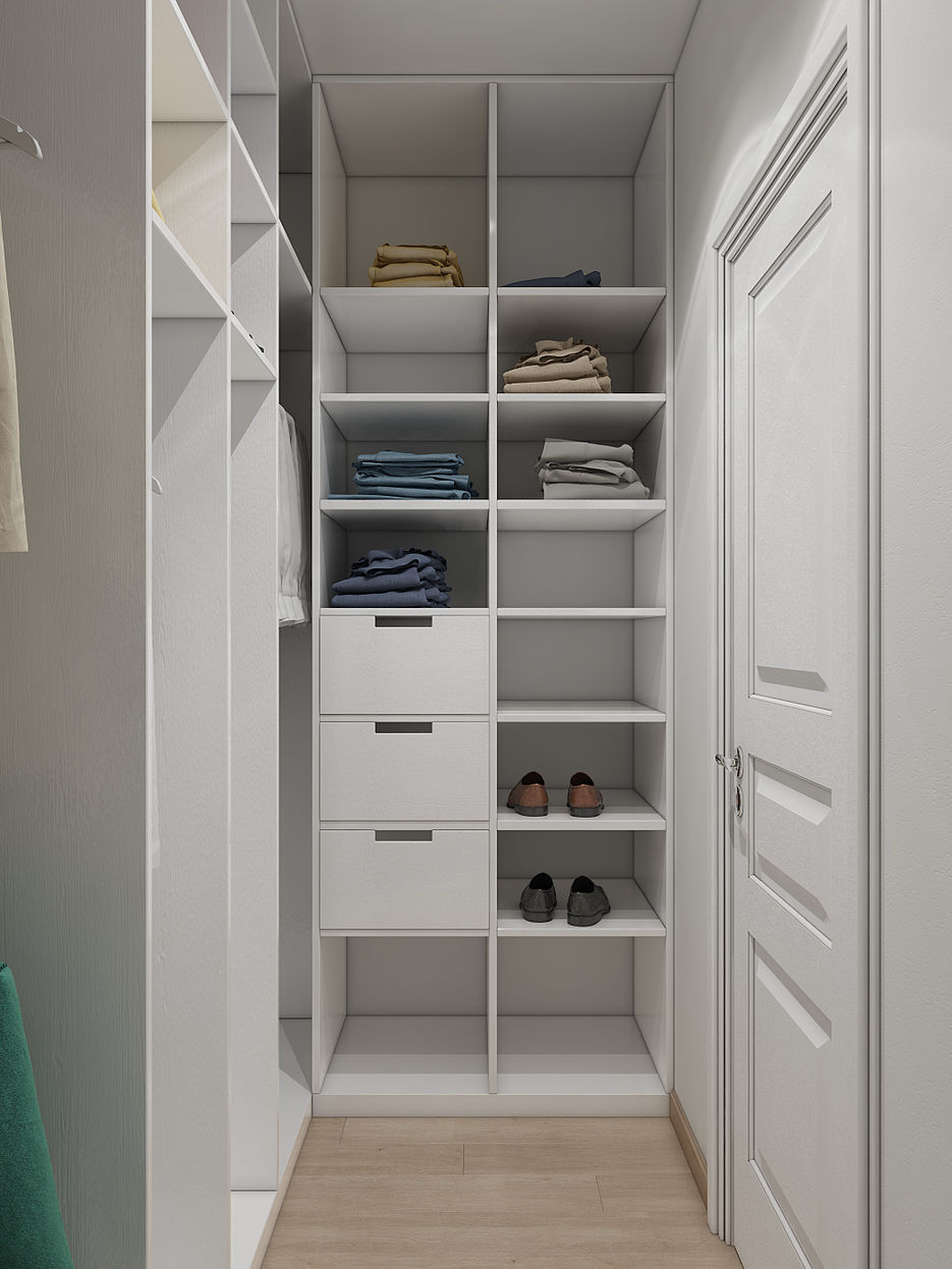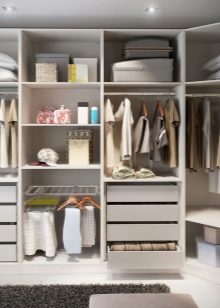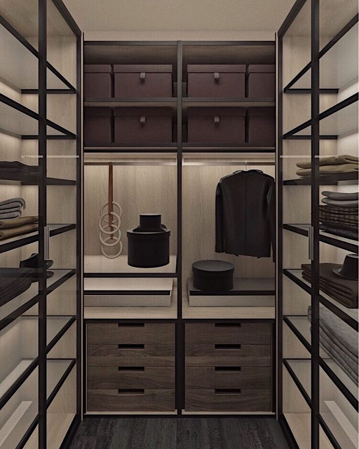 At the bottom of the system, you can place compartments for shoes, in the central part you can make a compartment for dresses and suits that need to be hung. On the sides there may be storage spaces for things that are least used, and on top you can store things and accessories that are necessary only for specific seasons. Drawers can be made for gloves, belts, ties, caps and other little things.
