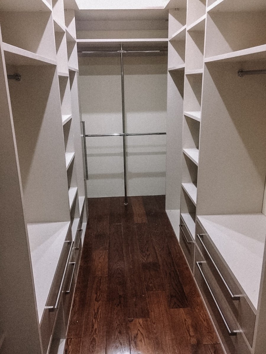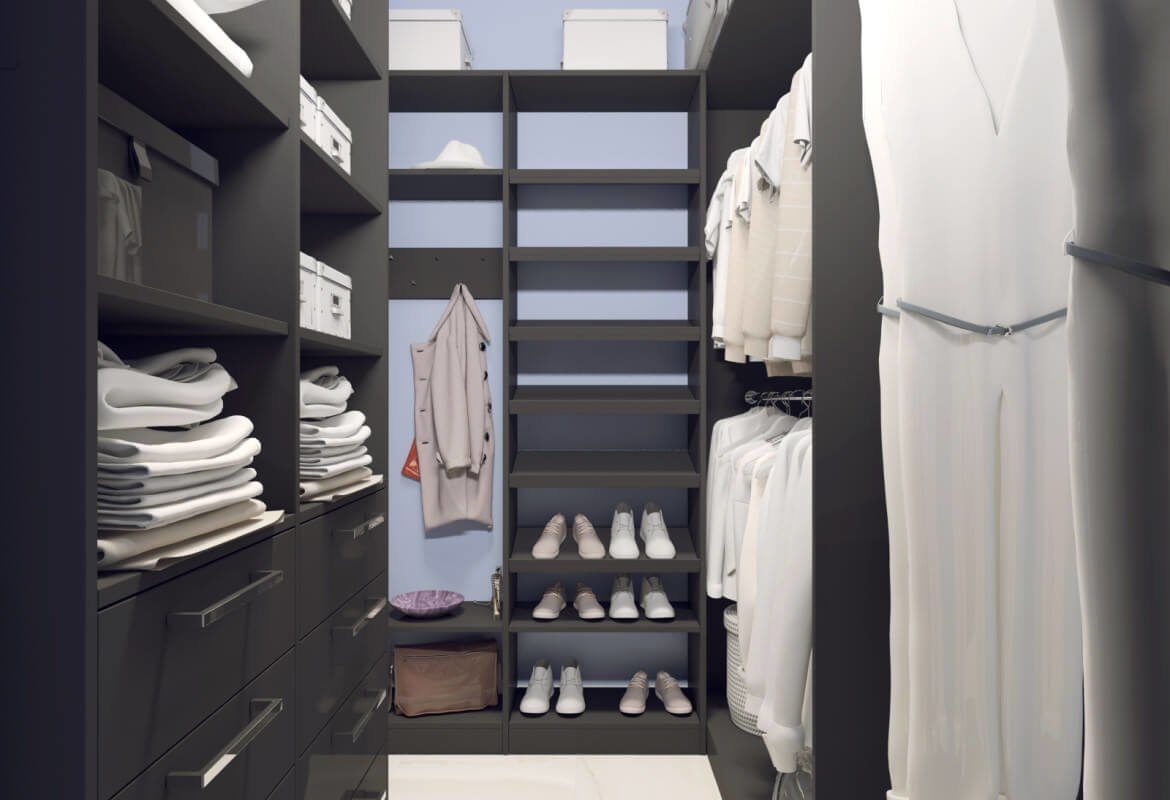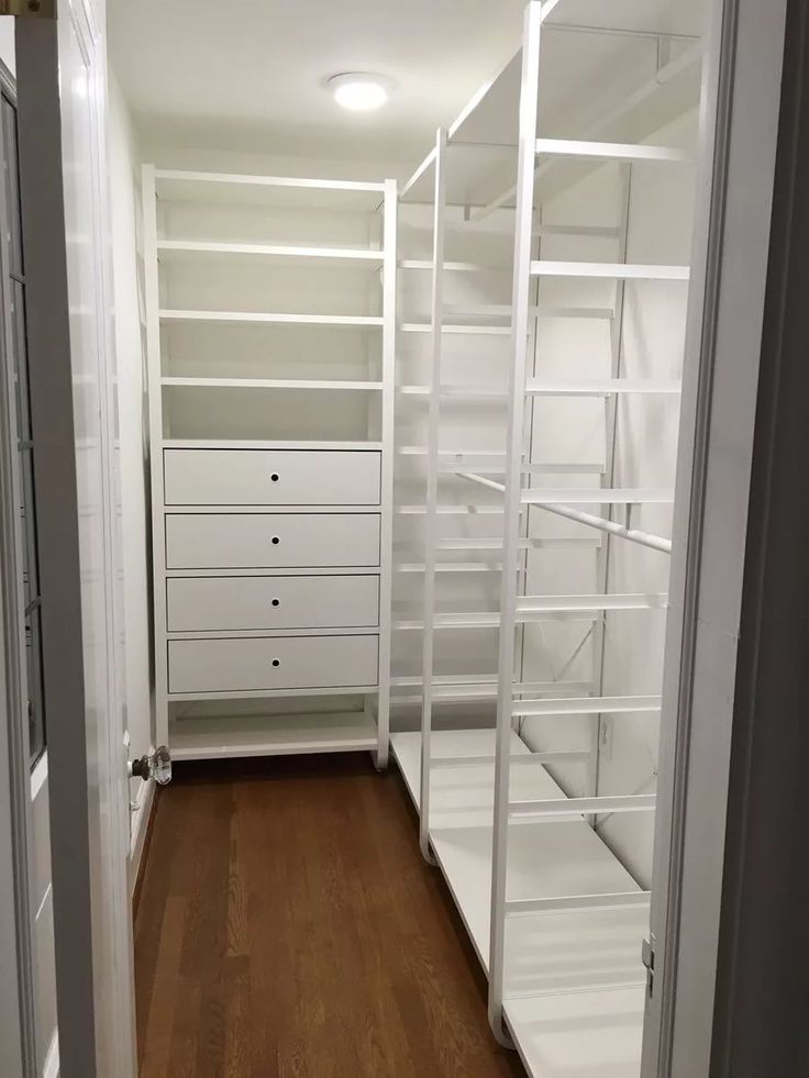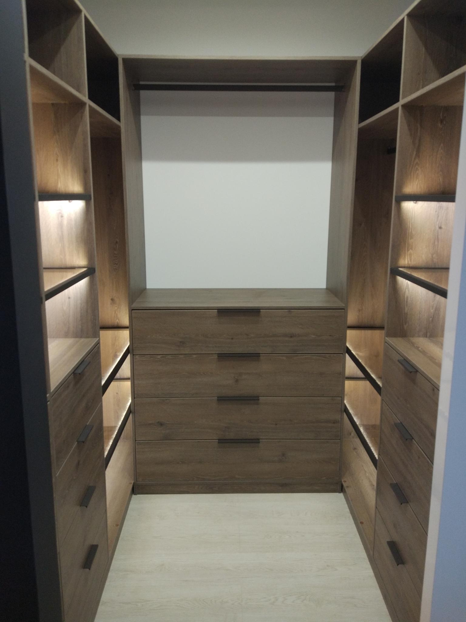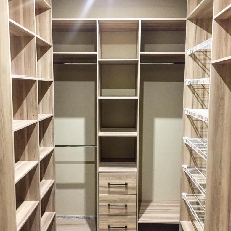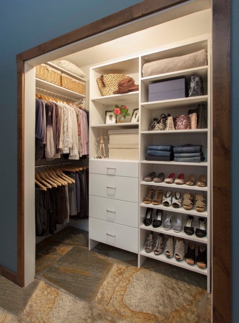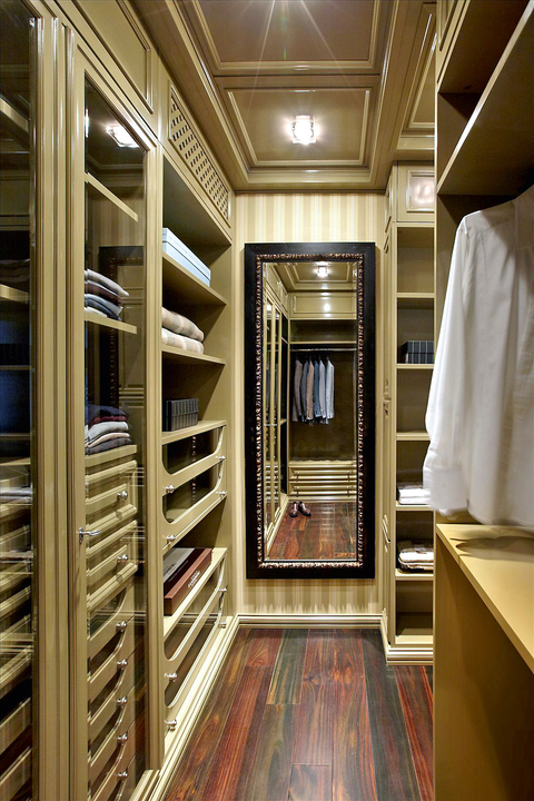 At the bottom of the system, you can place compartments for shoes, in the central part you can make a compartment for dresses and suits that need to be hung. On the sides there may be storage spaces for things that are least used, and on top you can store things and accessories that are necessary only for specific seasons. Drawers can be made for gloves, belts, ties, caps and other little things.