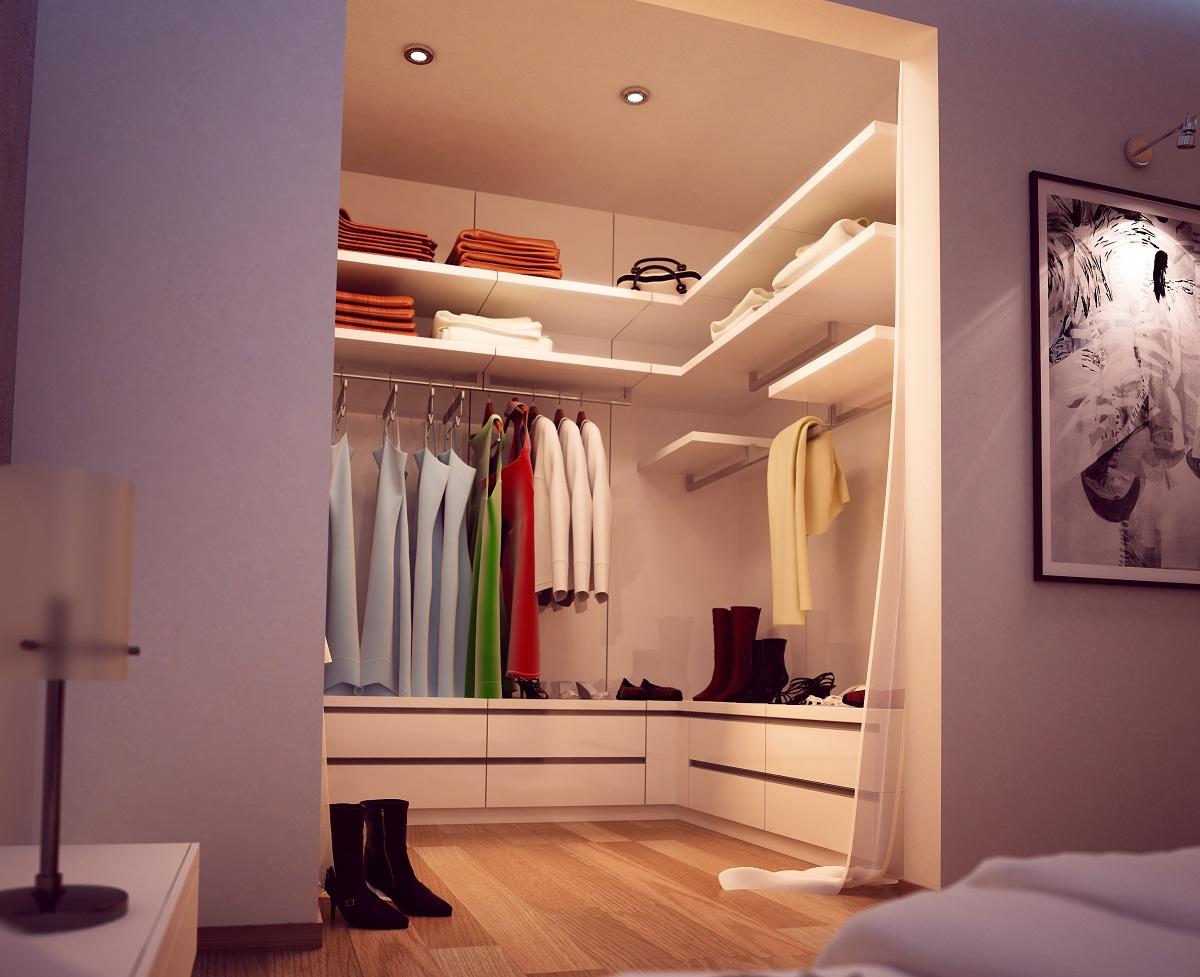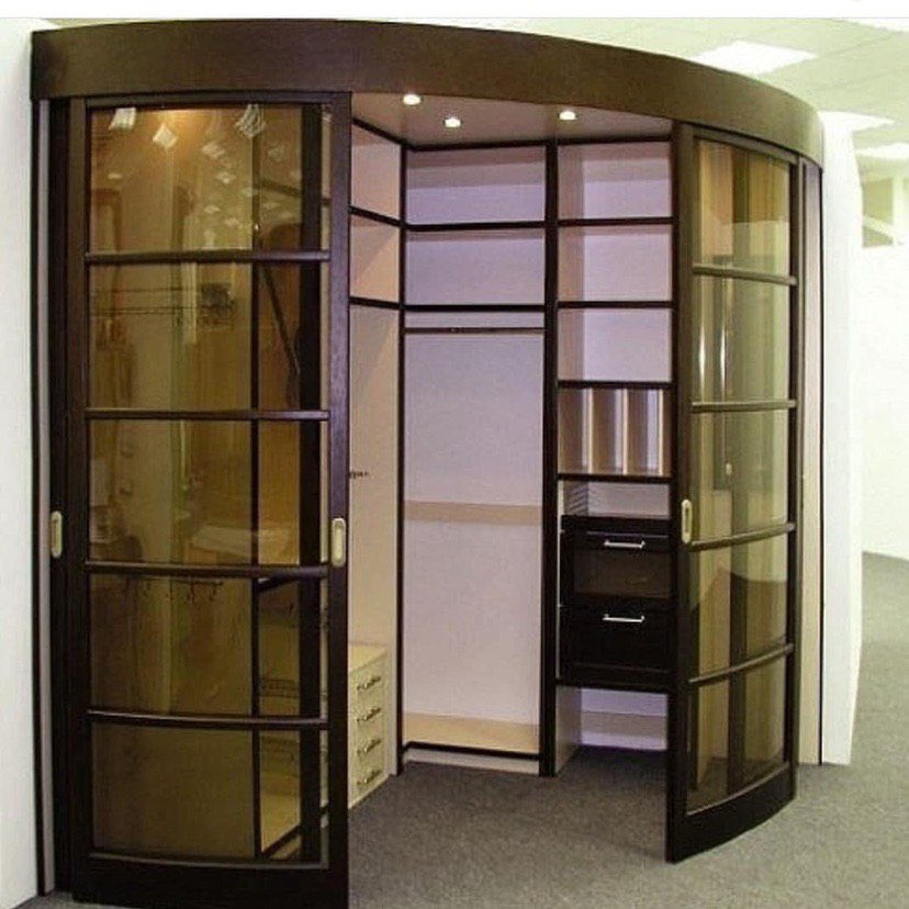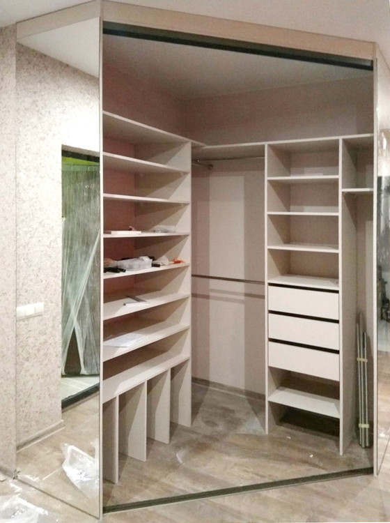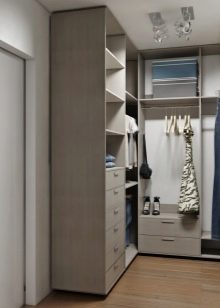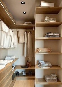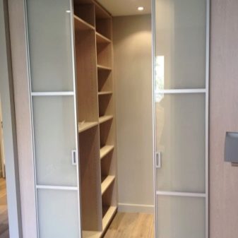 Angular. Corner walk-in closets can be open or closed. In the corner, along the walls, a partition is usually made for arranging shelving.