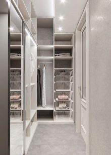 - Lovers of light shades can pay attention to the filling of the dressing room in a modern minimalist style. A parallel layout is used here, where the entire space is used to the maximum. All racks, drawers and cabinets are made of white wood-like material. Excellent lighting visually expands the space.