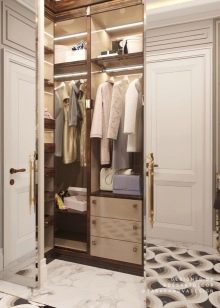 It is worth decorating the dressing room in the same style as the entire apartment or house. Thus, this small room will perfectly fit into the interior of the home as a whole.
