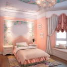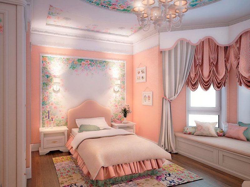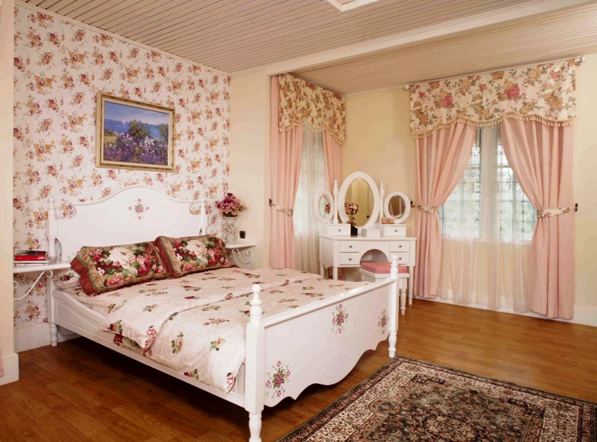 The ceiling must be covered with white plaster or paint: this allows you to visually enlarge the room and give it lightness. For the walls, you can buy wallpaper with a floral motif or paint it yourself. If it's scary to draw on your own, you can make a stencil or invite a master. The floor is covered with parquet or laminate, and you can save money by using wood-like linoleum.
