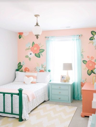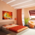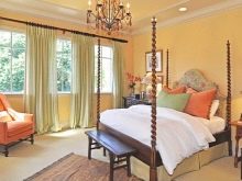 - Bright peach shades in combination with green and yellow colors charge positive for the whole day. Waking up in such a bedroom is a pleasure.