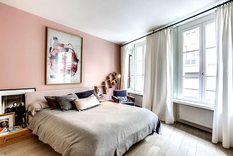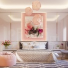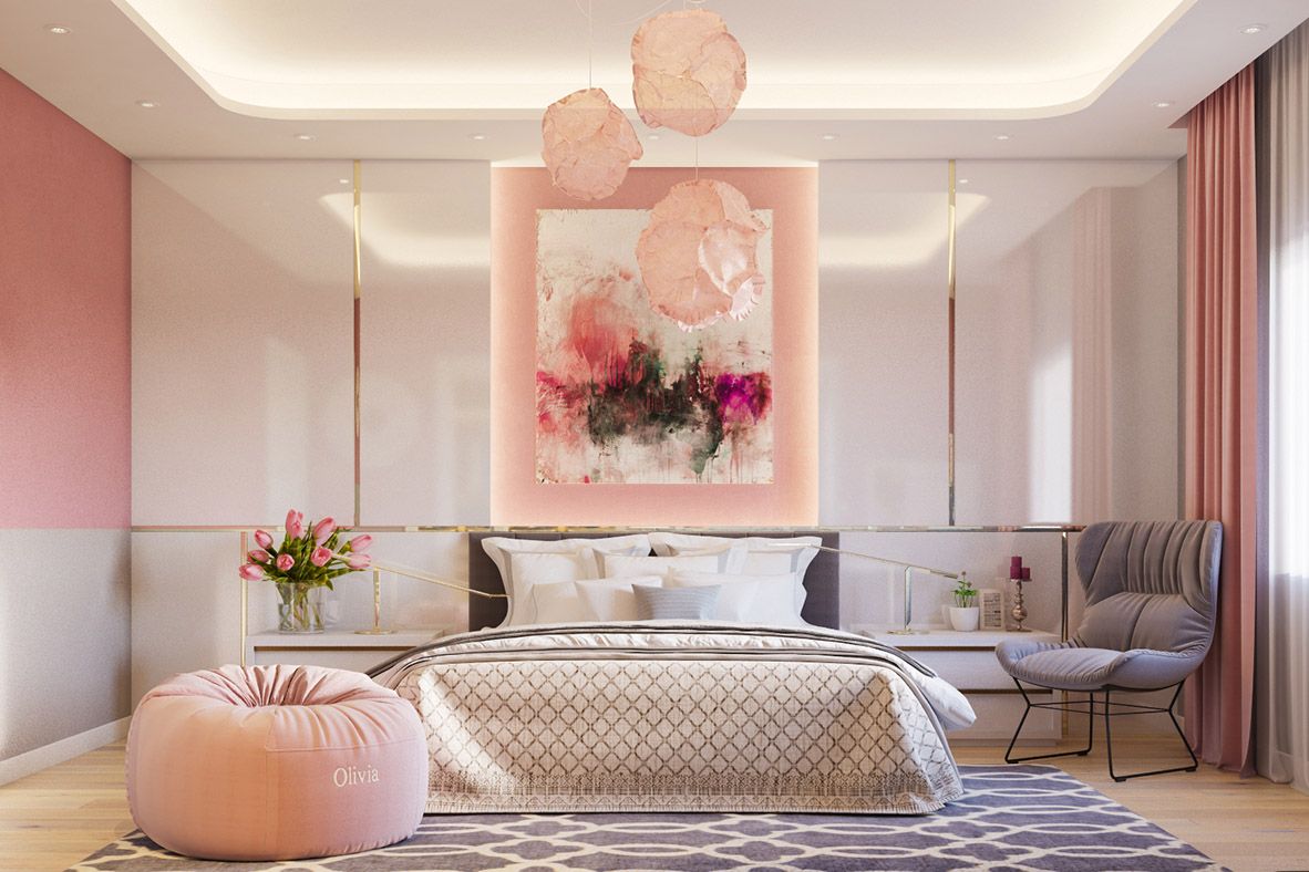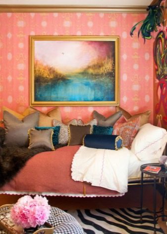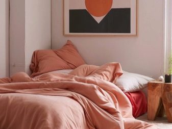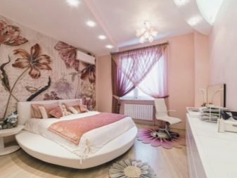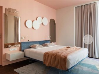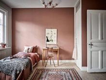 The peculiarity of the style is the absence of a large number of small details, but at the same time, you should not completely abandon the decor. For example, you can complement the room with a bedspread or carpet in pink shades.