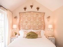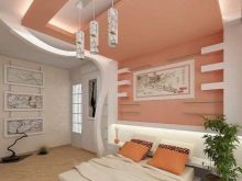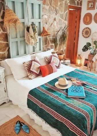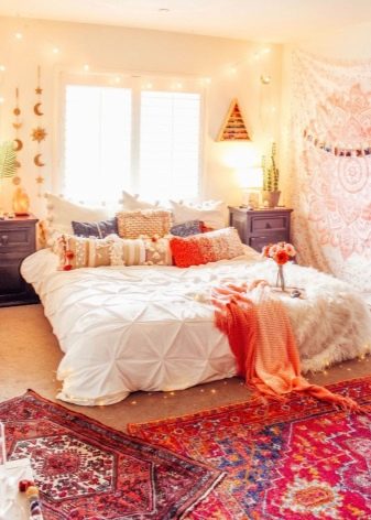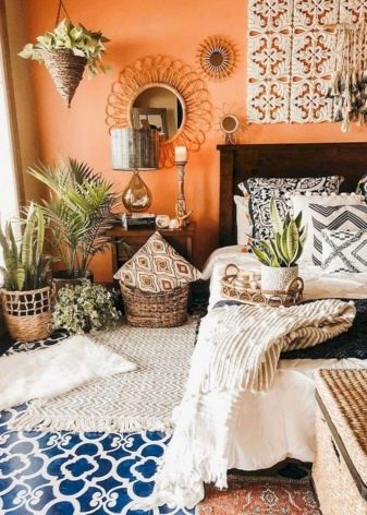 Boho is the complete opposite of minimalism. The main rule to follow when decorating a bedroom is no rules. To decorate the ceiling, you can use matte peach paint or a fabric stretch ceiling. The walls can be covered with plaster, fixed on them with plasterboard stucco or pasted over with wallpaper with any pattern. It is best to choose tiles for floor decoration.