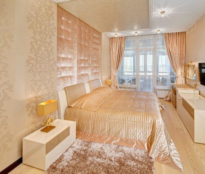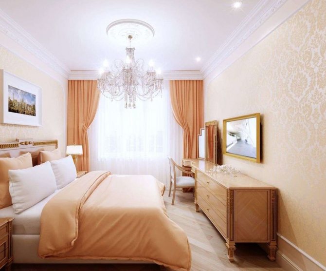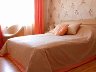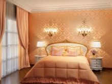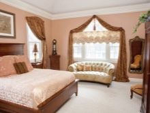 The decor should match the curtains, but slightly different from the main subject in the room - the bed. You can make a bright accent on pillows, paintings or peach-colored lighting.