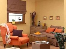 Peach shades can be located both on the wall and in decorative elements: curtains, pillows, carpets. The room can be supplemented with a large and soft floral armchair, where the main color will be a shade of peach.