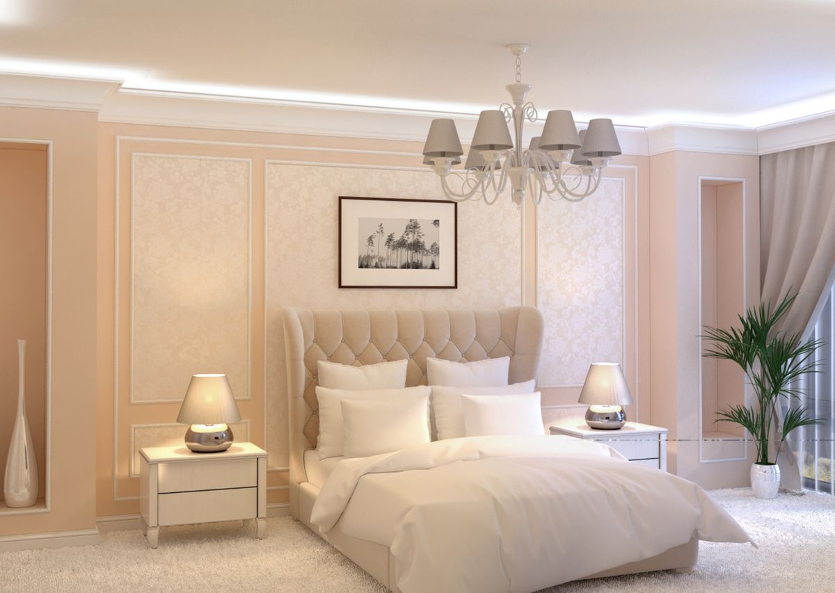 Classics and minimalism are very similar: they imply austerity and the absence of numerous decor. Beige walls with a hint of peach, combined with glass, brick, iron and wood surfaces will be the perfect solution for the bedroom. It is important to note that all coatings must be uniform in color. It is better to choose pieces of furniture in gray or beige shades.As for the pillows and bedspreads, they should be brighter: rich peach or yellowish color.