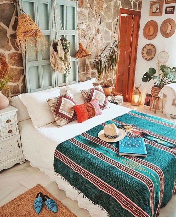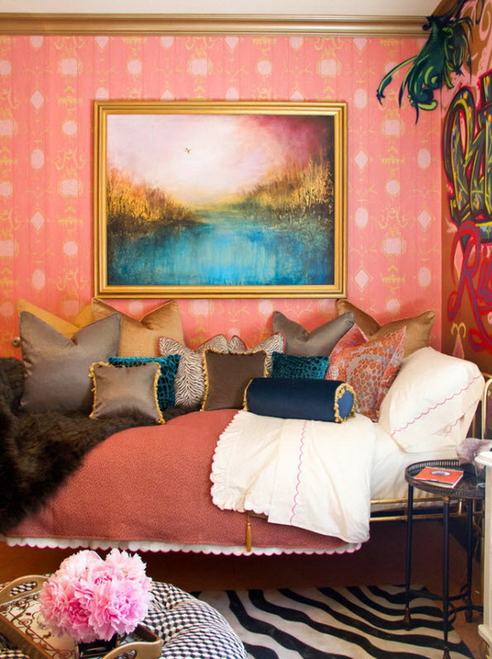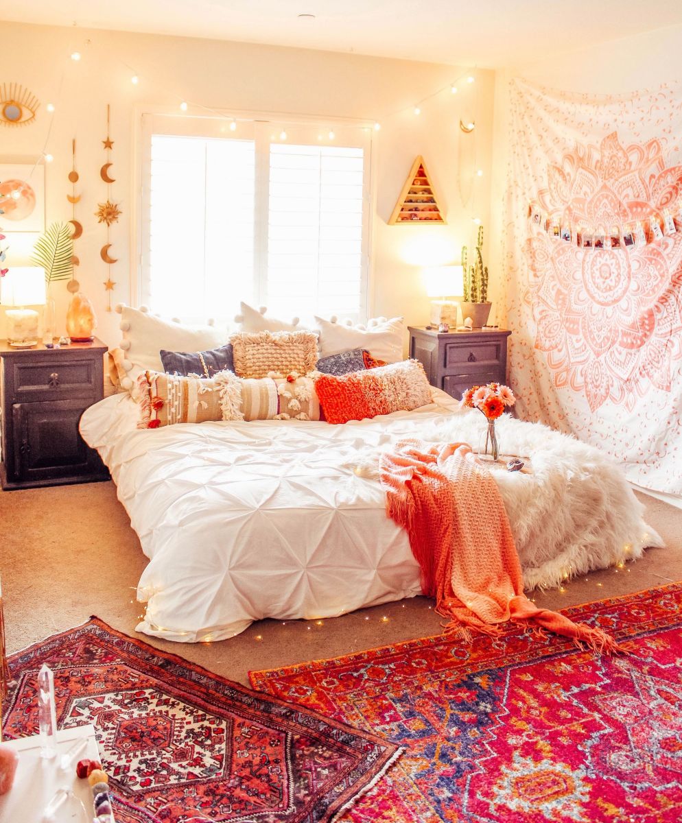Bright shelves littered with books, flowered lamps, pillows and ottomans will also perfectly fit into a boho-style bedroom.