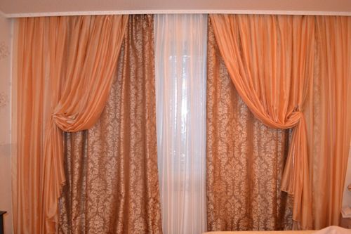 - the ornament on the peach-colored curtains is suitable for a Provence-style room or for an oriental interior;