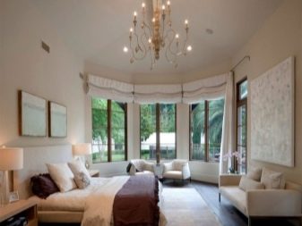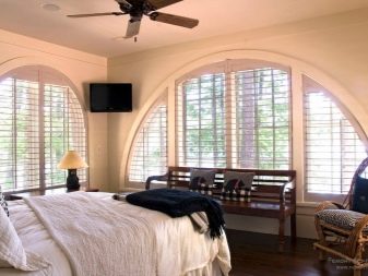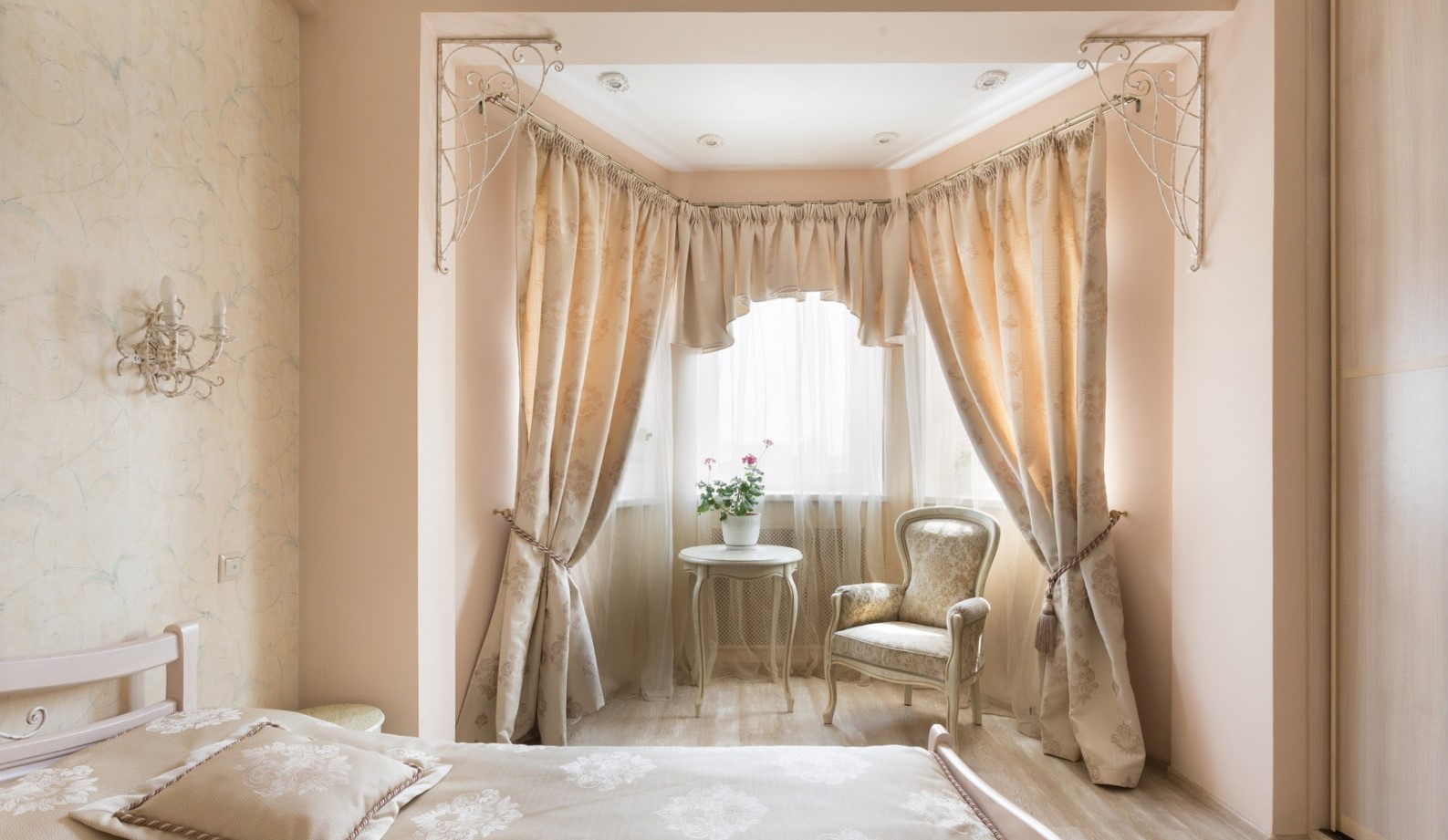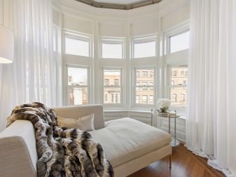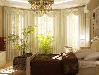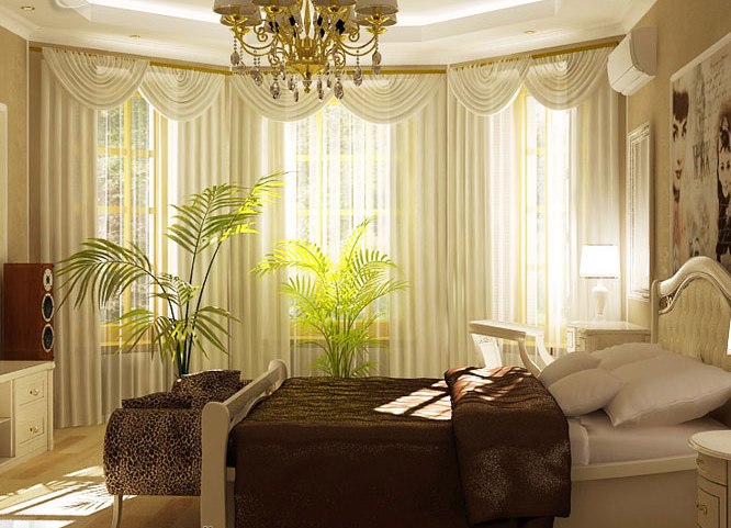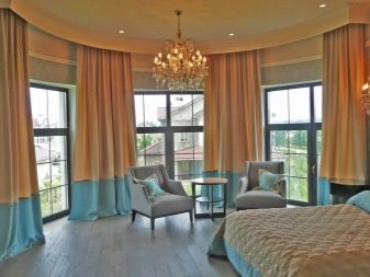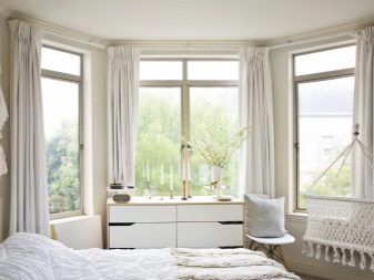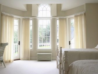 In bedrooms with a round bay window, curtains are chosen purely to your liking. But you can afford much less liberties with the cornice - it must necessarily follow the contour of the structure itself.Lightweight curtains are suitable for daytime use. At night, it is recommended to use structures made of dense fabric, including models with lambrequins, with other decor. If you want to achieve a modern look, you can use roller blinds.