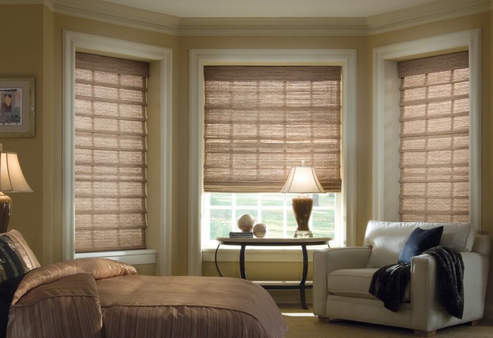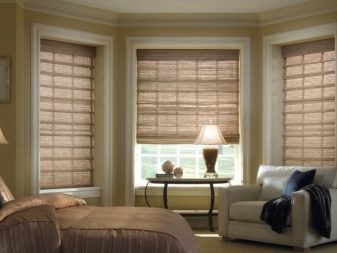 Roman blinds are considered a versatile solution. They are grouped in a certain position and collected in folds. But to make the composition look lighter and expand the room visually, it is worth using tulle. Curtains are good because they fit into any bay window. They are mainly used as a dominant accent element.