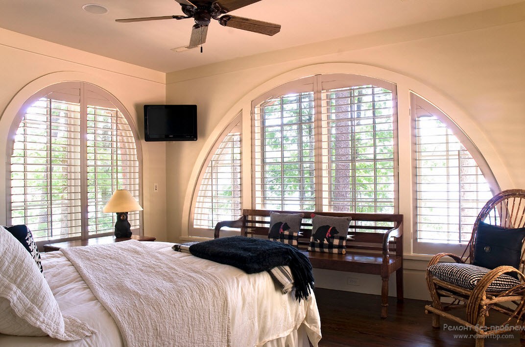 The widest variety of their types allows you to arrange any kind of composition. But in order to beat the window of a non-standard shape, to attract attention, French curtains are recommended. The Austrian type of curtains is also original, but slightly heavier (which is also important in many cases).